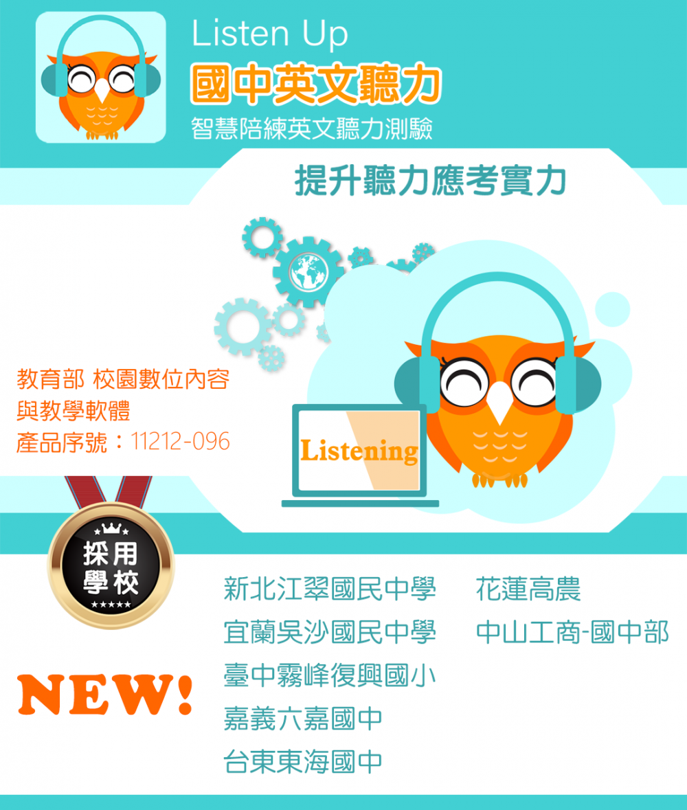 江翠國中、吳沙國中、東海國中、六嘉國中……等採用 Listen Up 國中英文聽力練習系統,讓學生能線上自行練習英文聽力,個別化的學習設計協助弱勢學生提升英文聽力