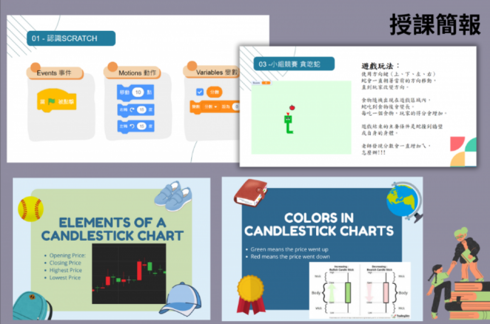 目前開發各種金融訓練課程及AI科技互動教材,提供不同年齡層學員學習,如: