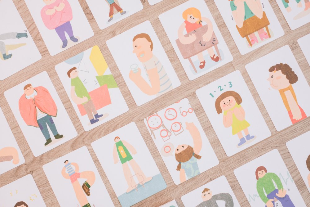 鬧卡設計由林孜育Mia繪製插畫,生動的動作圖案,讓人可以直觀理解,搭配文字進入畫面,不論年紀皆可參考圖文提醒,在工作生活中關照自己,穩定他人。