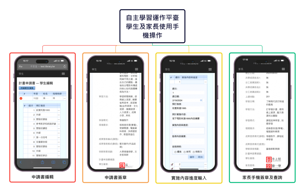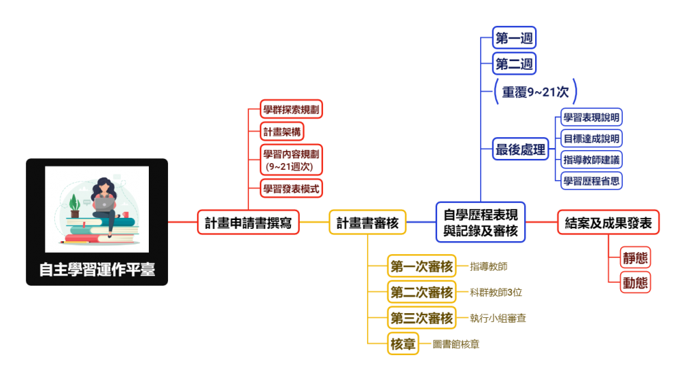 計劃書撰寫、審核、自學表現錄、審核及成果發表,一貫作業