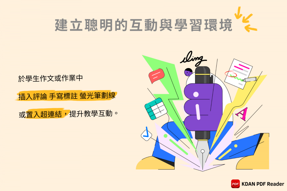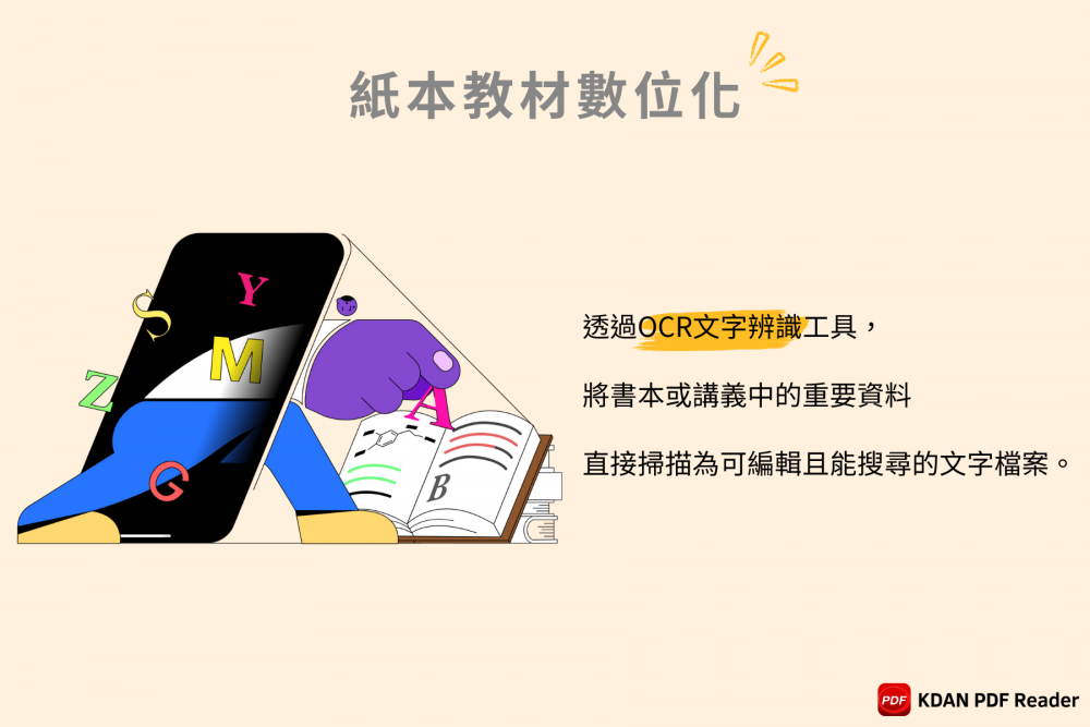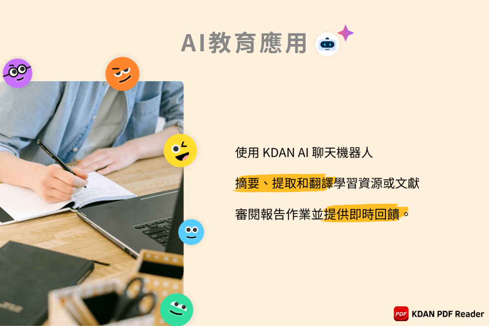 KDAN PDF Reader 提供文件數位化工具,學生及教師能輕鬆將紙本資料轉化為PDF,方便分享、管理和保存,並客製化學習素材;AI教學助理更提供24小時服務,幫助學生探索教材內容、取得作業建議,提升學習效率和成效;此外,使用者也可藉由文件加密、AI自動遮蔽等工具防止重要資料外洩,讓數位學習更安全且更有效率。