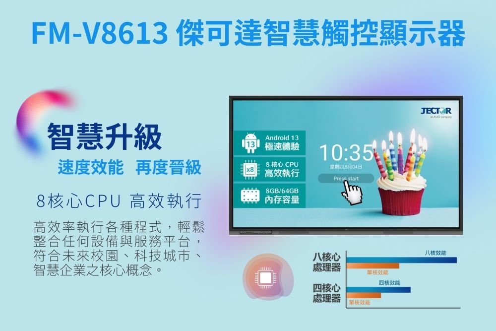 FM-V8613搭載業界領先的八核心CPU和Android 13作業系統,結合了卓越的效能與穩定性,為電子白板提供更多進階操作應用。安卓13獨有的子母畫面多工特性可透過手勢快速操作,配合8核心CPU高效能規格,瀏覽網頁與操作APP更加快速流暢。零貼合技術使觸控書寫更精準,減少反光保護師生視力。Type-C介面支持顯示觸控與供電,方便連接手機和平板,並支持無線投影、多屏分享功能,多樣化輸出入連接埠讓智慧教室輕鬆建置。