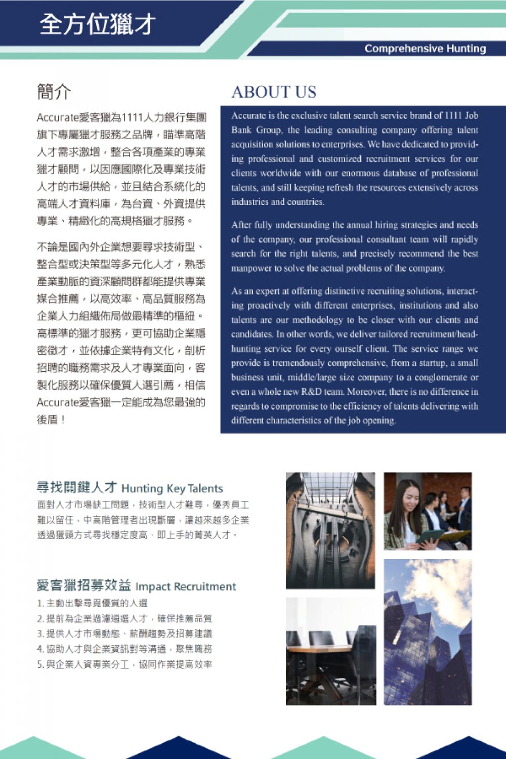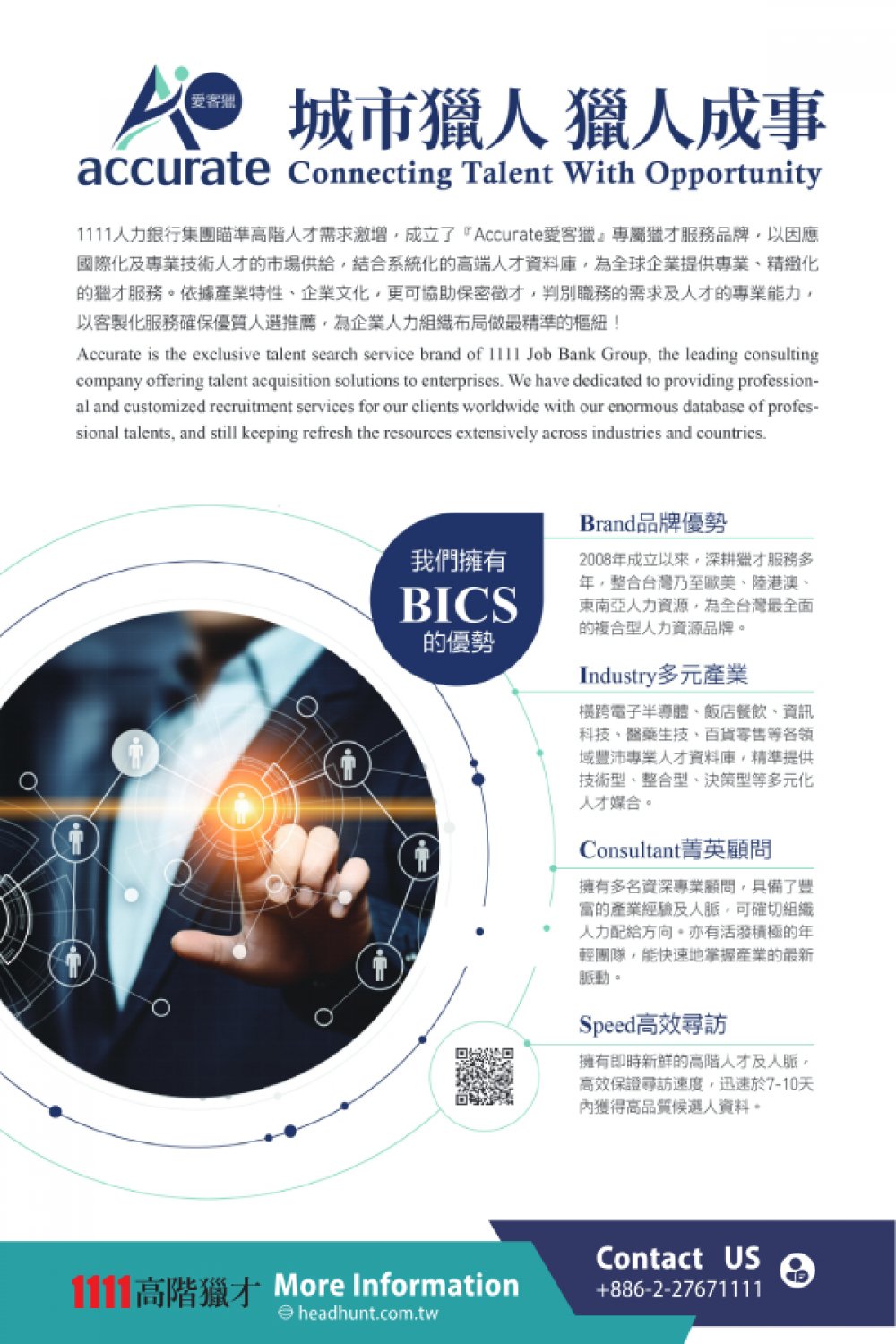 『Accurate愛客獵』為1111人力銀行旗下專屬獵才服務品牌,瞄準國際化高階人才需求激增,提供技術型、整合型、決策型等多元化人才,為全球企業提供專業、精緻化的高規格獵才服務。諮詢專線02-27671111