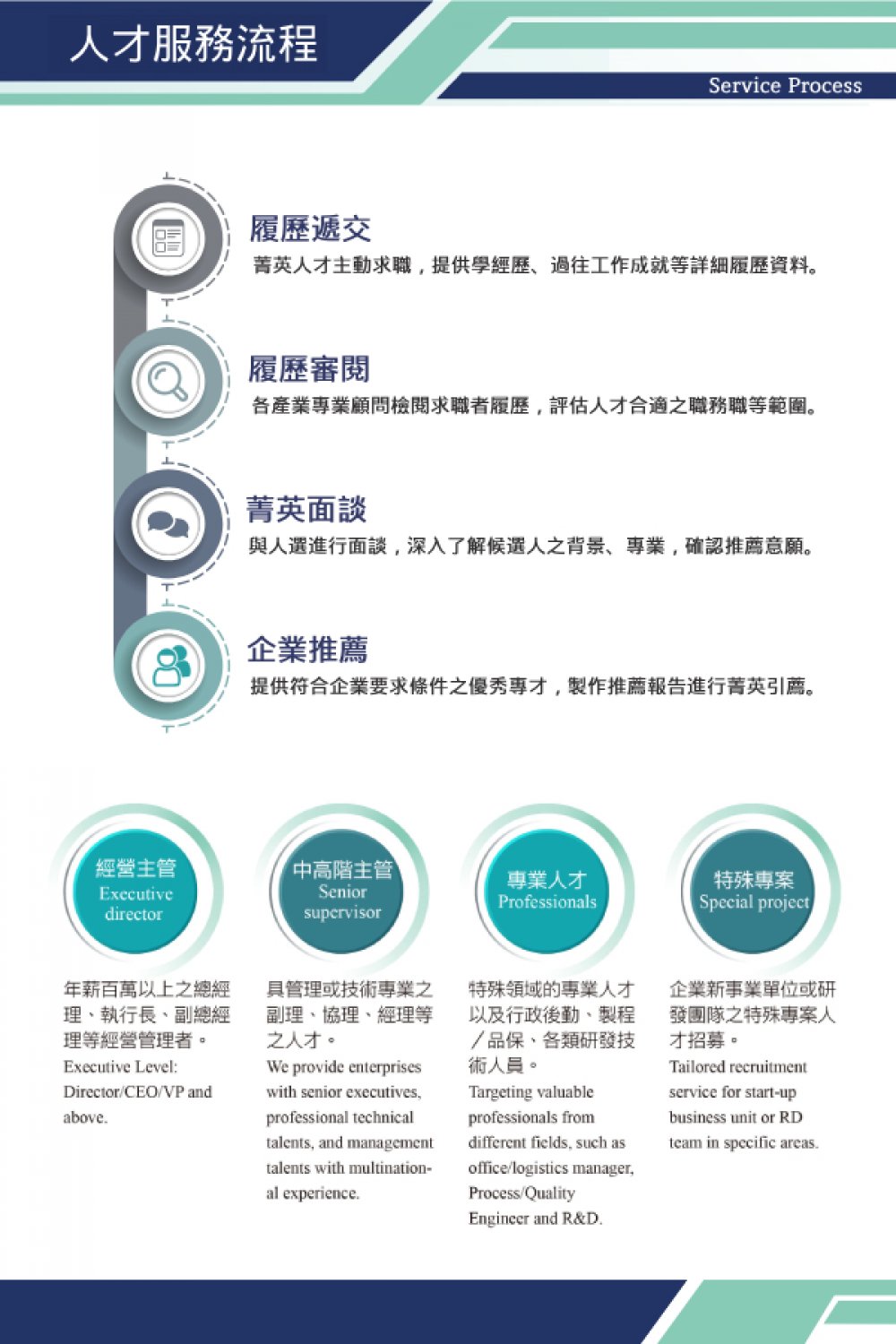 【企業菁英獵才】企業中高階主管、核心幕僚、專業技術人員、儲備幹部人才搜尋,提供精準獵才與目標人選的招募服務。