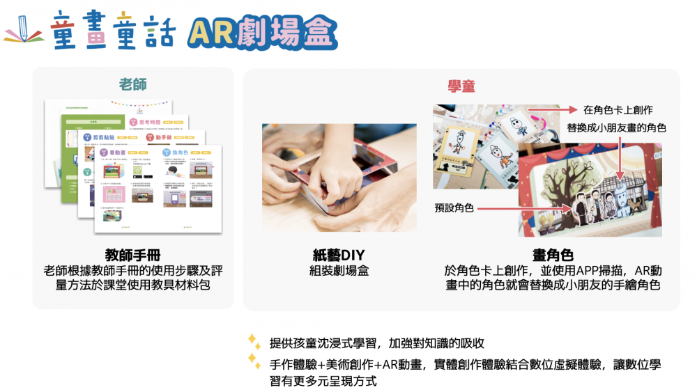 產品內附的材料包採立體紙藝拼圖,讓學童體驗動手實踐的樂趣,互動方式結合AR技術應用,開啟學童數位學習認知,互動內容促使學童創意發想設計角色,啟發藝術美感學習,從多方面帶給學童來自不同領域的基礎認知,培育108課綱中多元學習的能力。