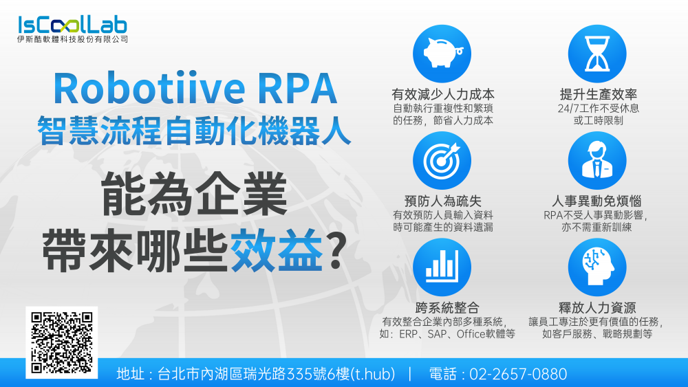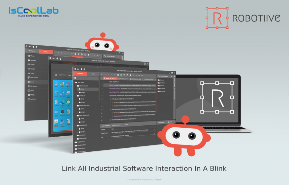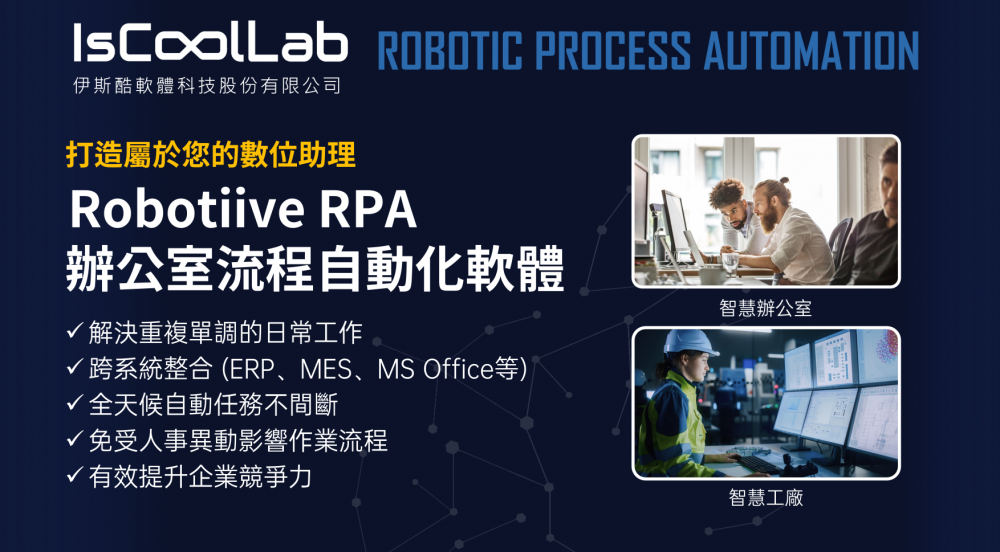 IsCoolLab 所開發的 Robotiive 企業 流程自動化軟體,使用 AI 電腦視覺專利技術達成跨平台、跨系統、跨機台、遠端桌面的數據串接及自動化,是市面上唯一一家可從工廠產線到辦公室都可串接之 RPA 系統。Robotiive 不僅大幅提升了企業的生產力和效率,還能顯著降低人力資源和營運成本。此外,其高度的可擴展性使得企業能根據自身需求進行客製化設定,為各部門提供24小時持續運作的數位勞動力。