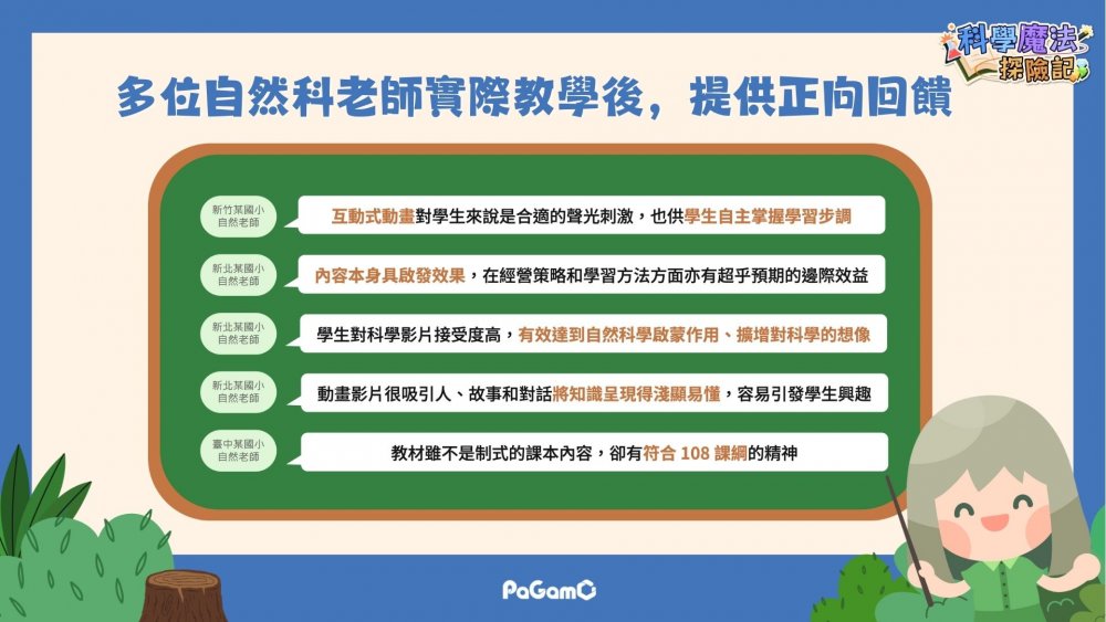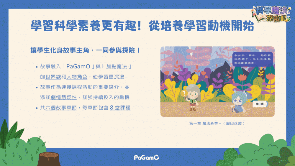 「PaGamO 科學魔法探險記」由一段冒險故事串聯所有精彩章節,適合國小三年級至五年級的學生奠定科學素養基礎。有別於一般的線上教學內容僅是單向輸出,「PaGamO 科學魔法探險記」的全篇內容由精緻的互動式動畫組成,供學生依照所學做出判斷,並且按自身節奏吸收內容,獲得置身探險情境的沉浸式體驗。