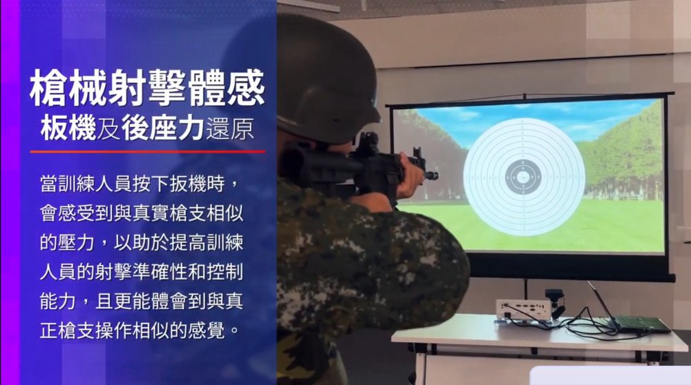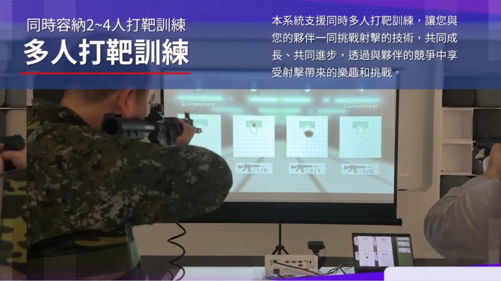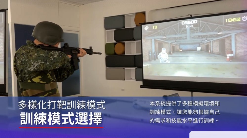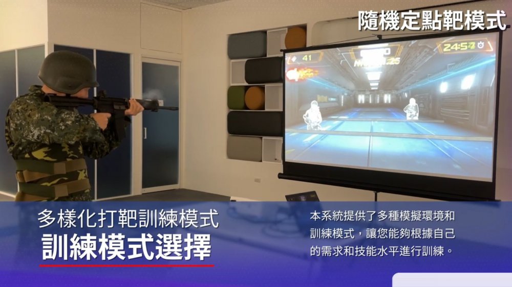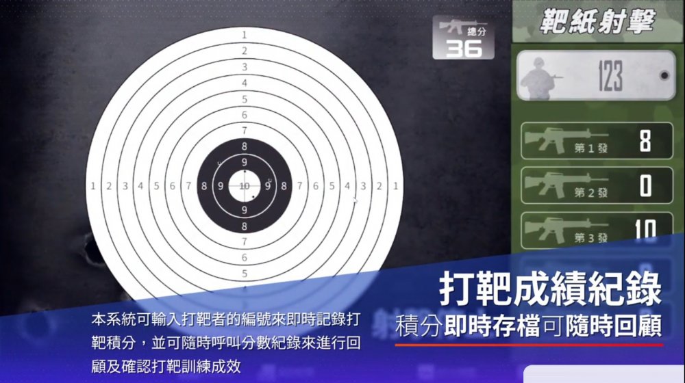 本系統提供了多種模擬情境及動態場域,可讓各年齡層的學生可以拿起國軍T91步槍完成射擊訓練,訓練任務分為靜態靶紙、計分靶紙、移動活靶及翻轉靶位四大類型,多人連線模式下更可進行排行榜比較,完成寓教於樂的國防教育基礎訓練,在國高中及大學階段軍訓課程,是一個有趣又能訓練心智肌力的國防教育方案