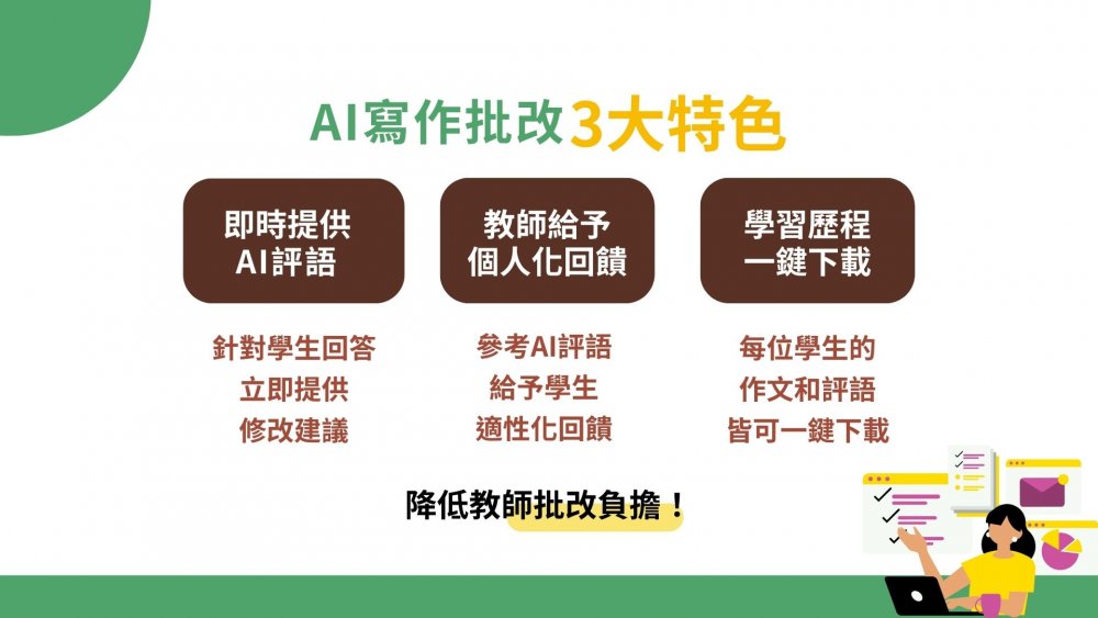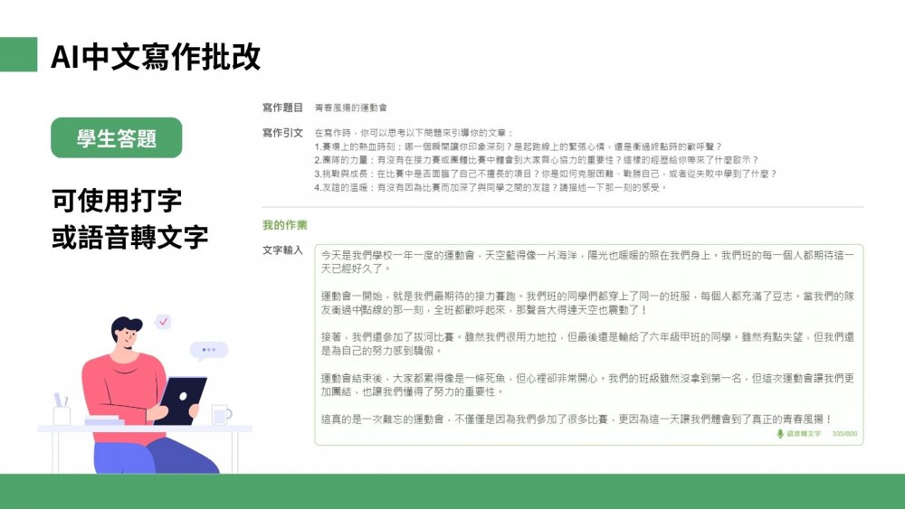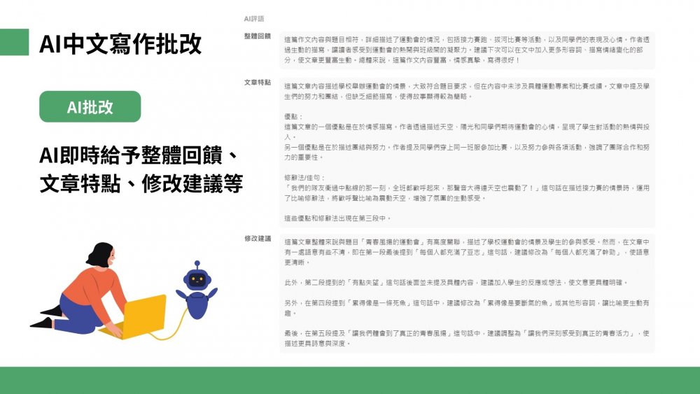 運用學習吧平臺教師指派作業及收繳作業的功能,讓老師能自由選擇出題類型(如:小日記、讀書心得、作文),並由學生自行上傳作文,透過AI大數據的運算,來初步批改、評價文章,給予各式不同類型的作文評分、評語與回饋。