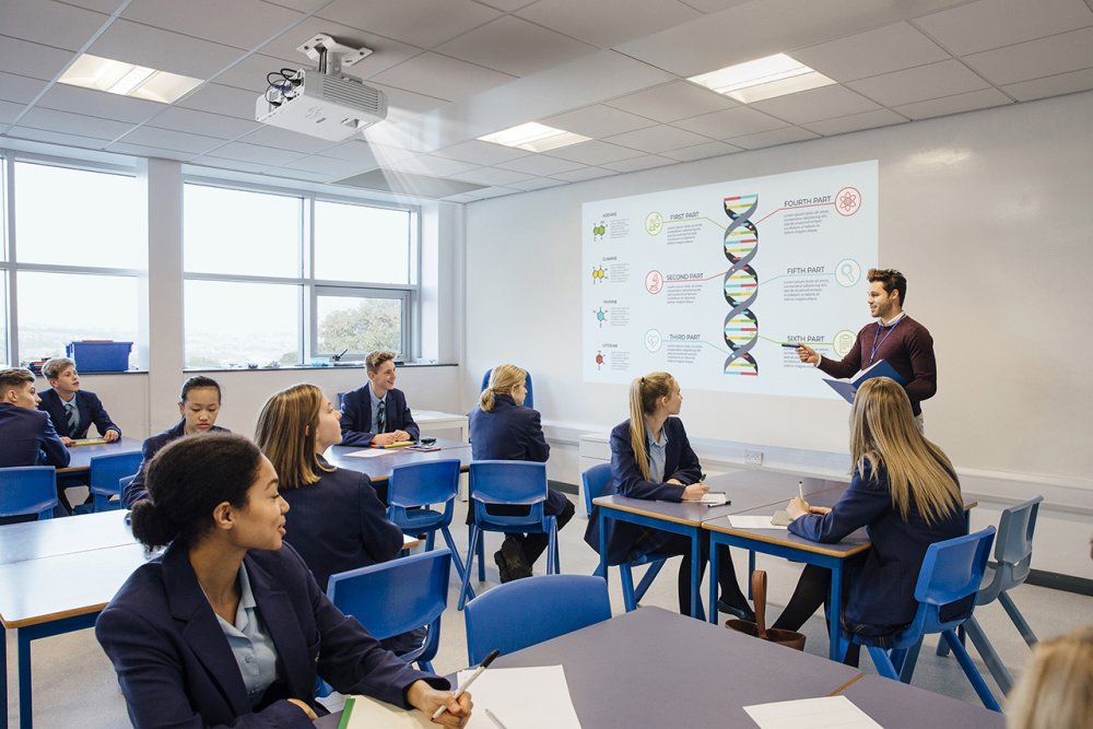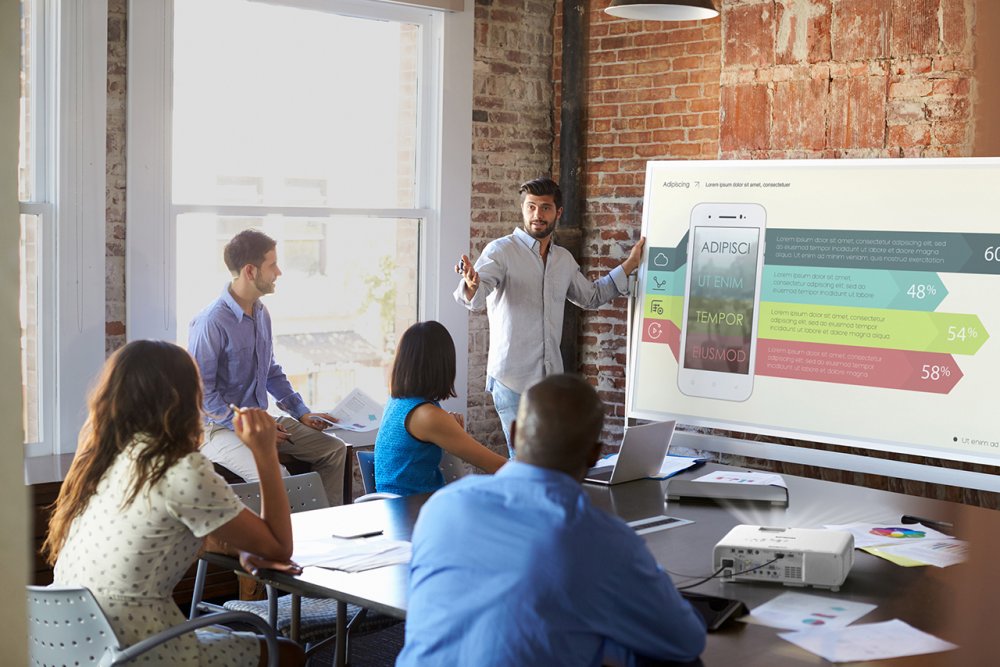 反射式超短焦投影設計,僅需60.1公分即可投射100吋大畫面。教學不受光影干擾更順暢。內建無線模組,支援無線及鏡像投影功能。