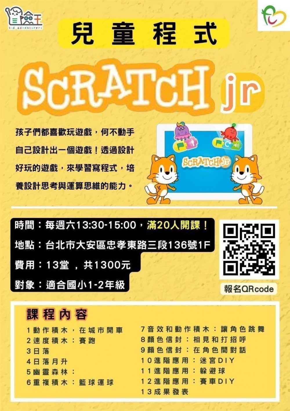 Scratch JR是由MIT(麻省理工學院)為國小低年級設計的一款簡易版的Scratch,透過圖像化 的程式方塊,使角色移動、跳躍、跳舞、唱歌,用程式完成孩子心中的想像。