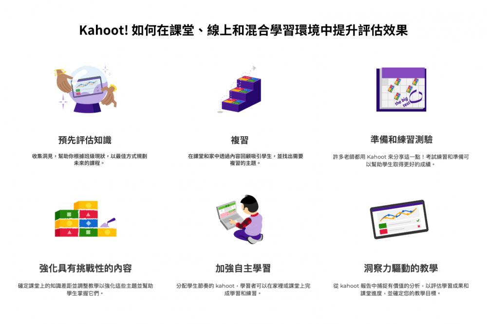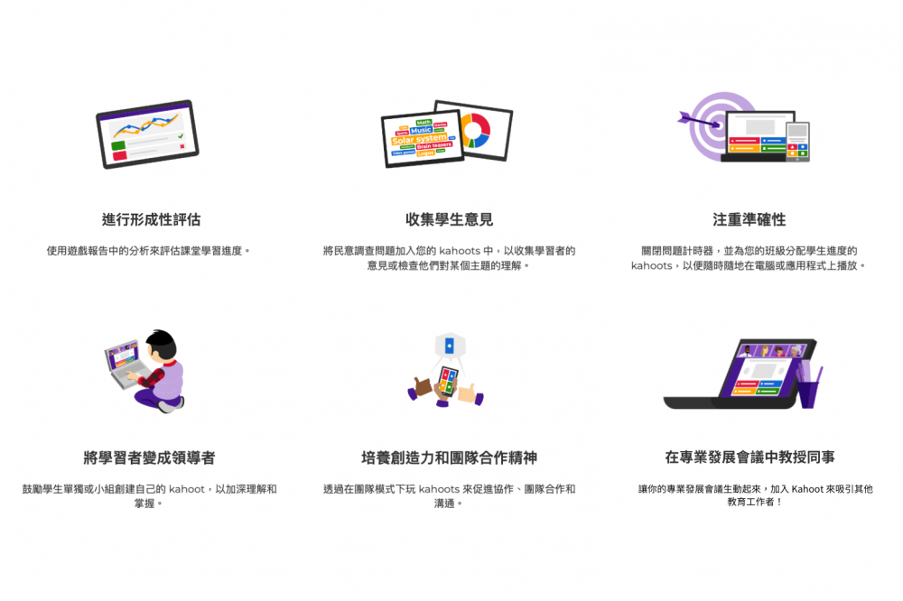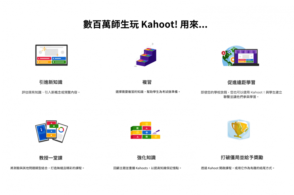 Kahoot! 是一個基於遊戲概念的學習平臺,每天全球有數百萬人在使用 Kahoot! 來找尋、創建、啟動和分享學習遊戲,在 Kahoot! 的公開圖書館中,您可以搜索超過一億個 Kahoot! 游戲,其中包括來自 Kahoot! 學院的高階內容,並可為您的課堂調整使用。
