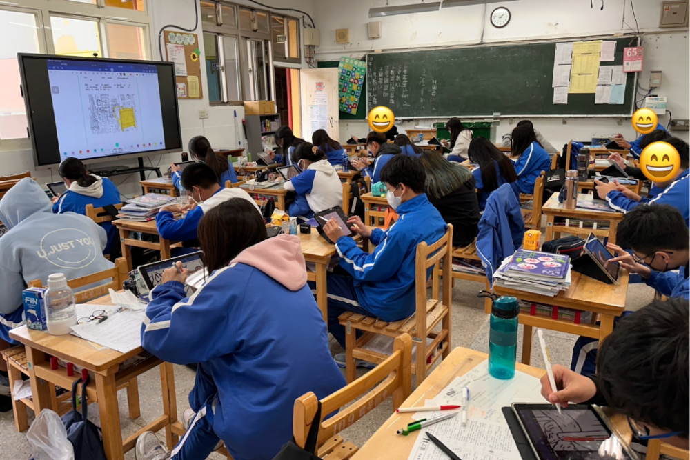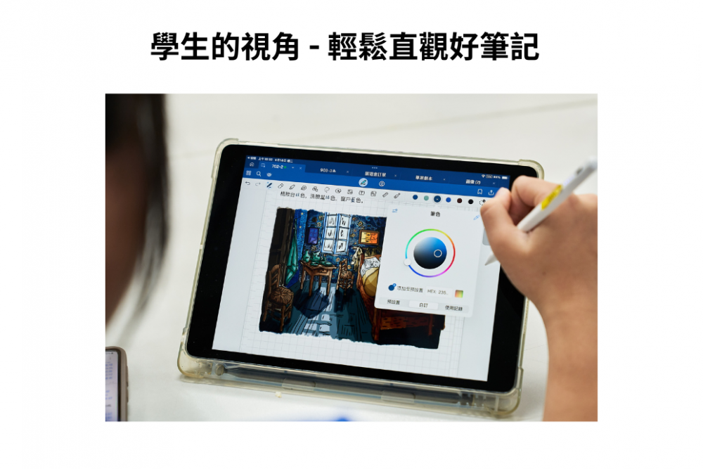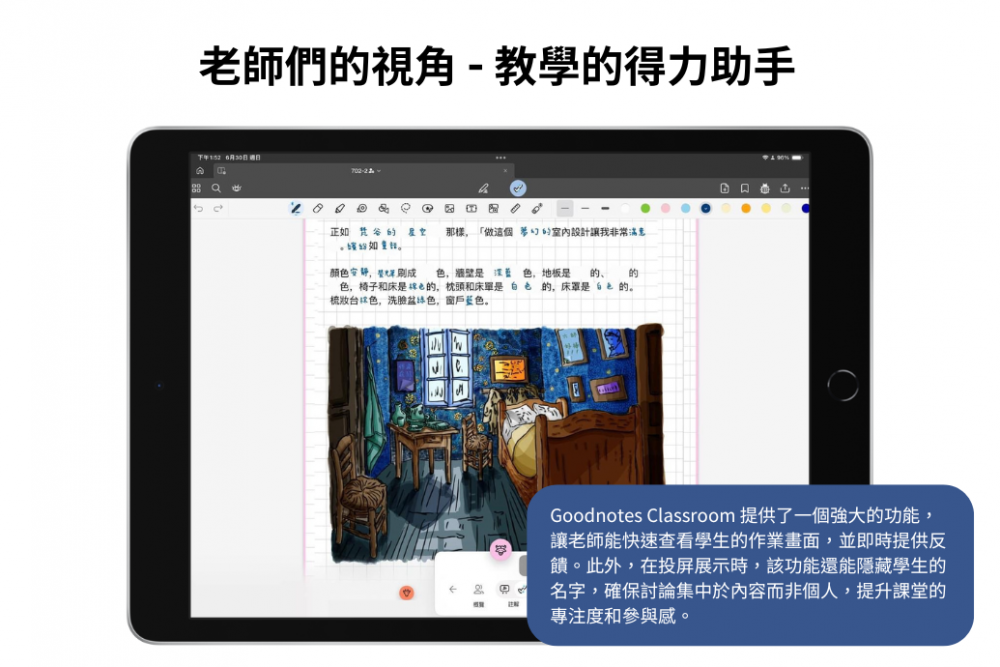教師透過 Goodnotes Classroom 讓每位學生的創作都能被全班觀摩和討論,學生發揮創意用筆記不同類型的筆、各種顏色、膠帶等各式工具進行藝術創作,教師將授課教材放入筆記中,即時呈現自己的筆記內容,更可以在大屏中切換學生的畫面進行討論,教師更透過 AI 批改分群功能,幫助教師可以直觀看到完全吻合、部分吻合以及完全不符的學生答案群組,並給予反饋。