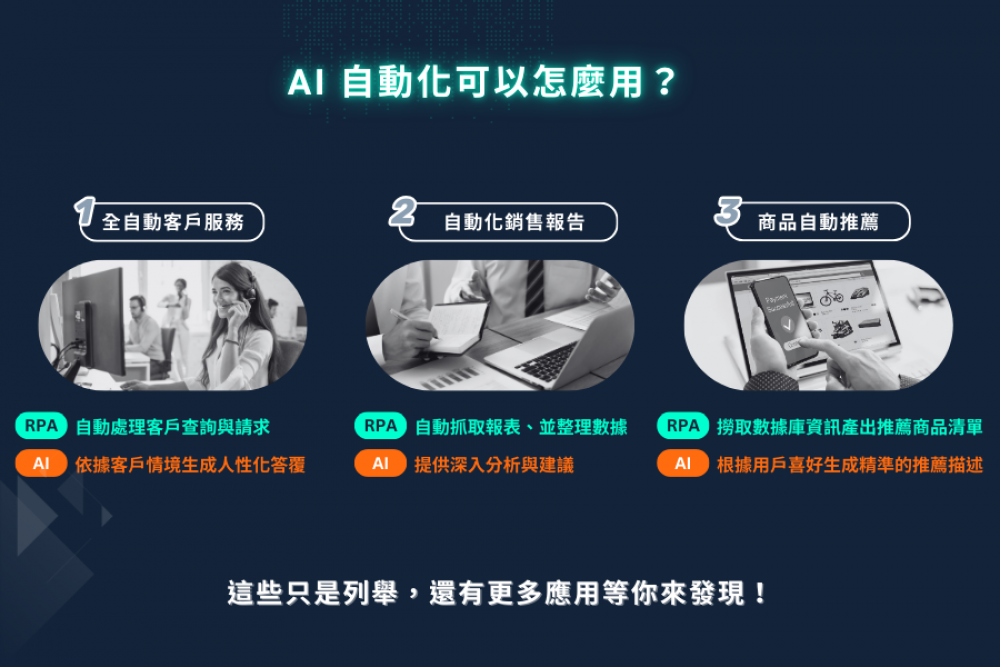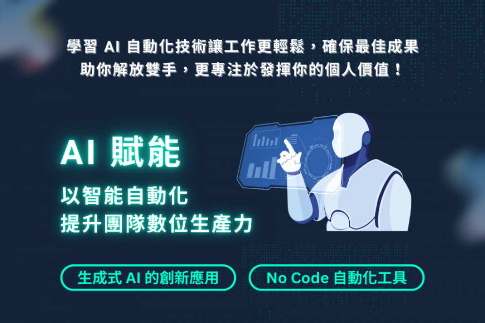 我們專注於 AI automation 的賦能教育,將人工智慧應用於組織革新,並透過自動化工具全面釋放企業潛力。我們致力以 AI 自動化推動人才與企業的雙向升級,促進產業發展,成為驅動台灣數位經濟成長的新引擎。