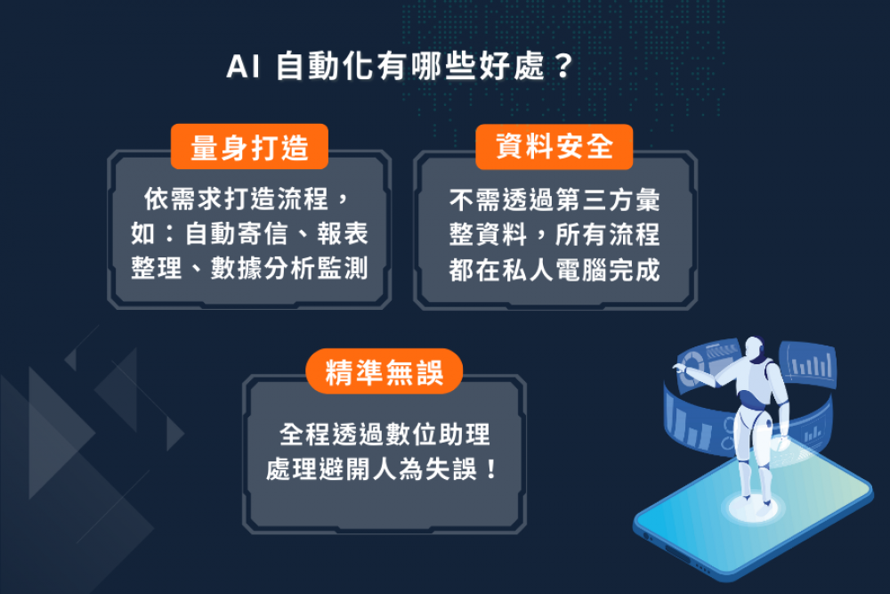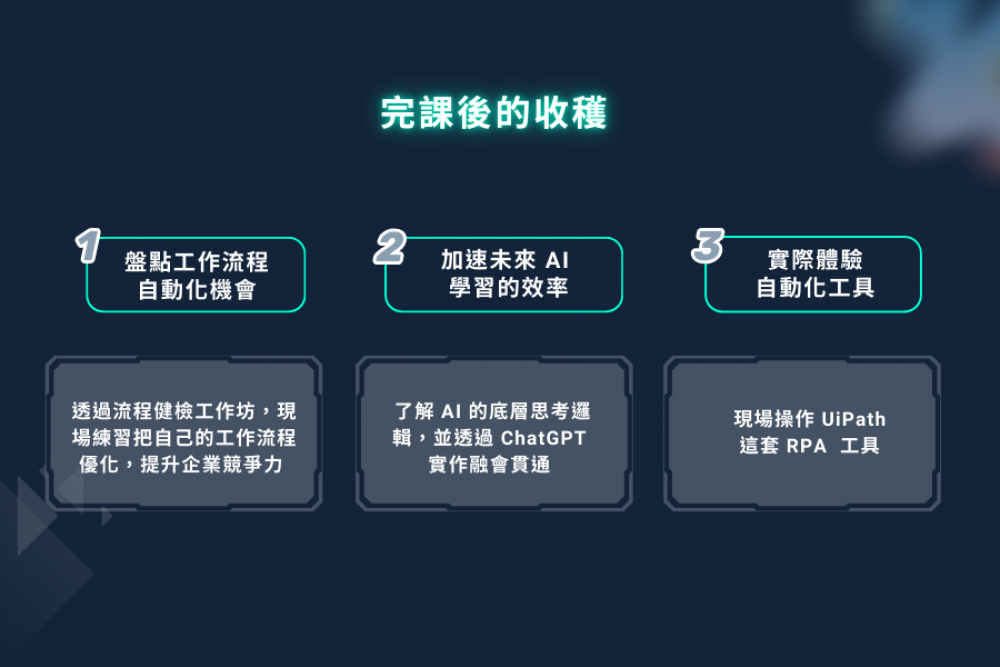 面對層出不窮的 AI 和自動化工具,您的團隊是否也在尋求能真正提升效率的解決方案?想讓 AI 提升效率,ChatGPT 的產出卻不如預期?重複性的電腦文書工作耗費太多時間,沒心力去做更多核心任務?如果您也有以上的困擾,那這堂課可以幫助您用了解 AI 的底層思考邏輯與應用,並探索自動化工具的無限可能。