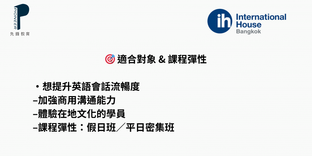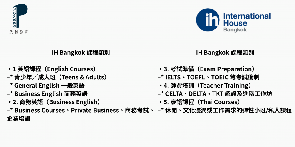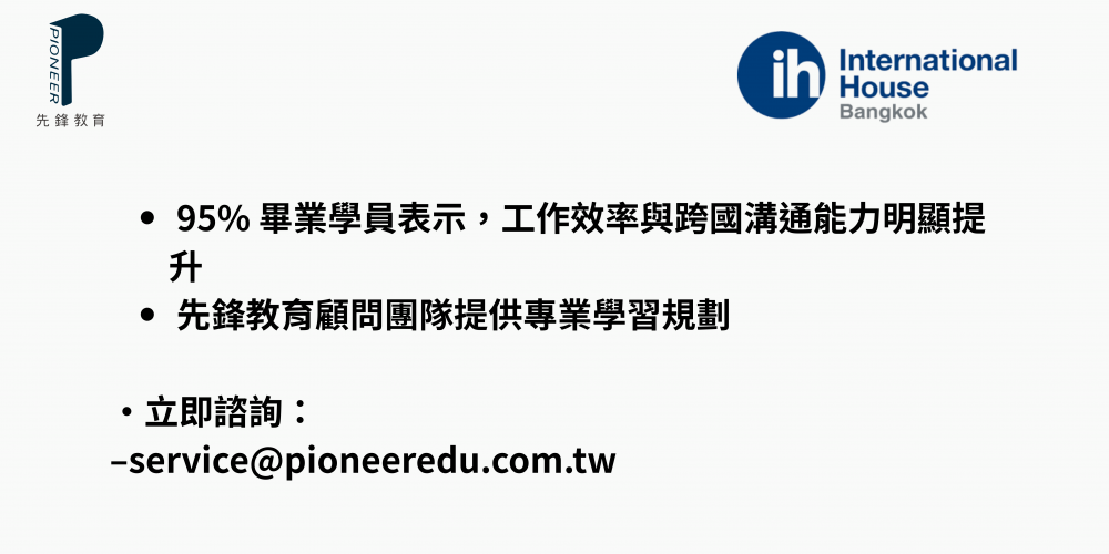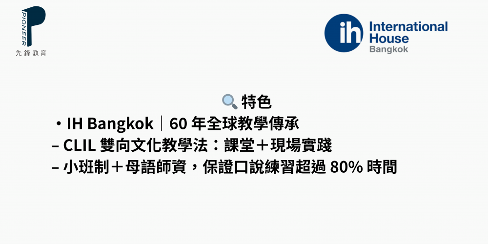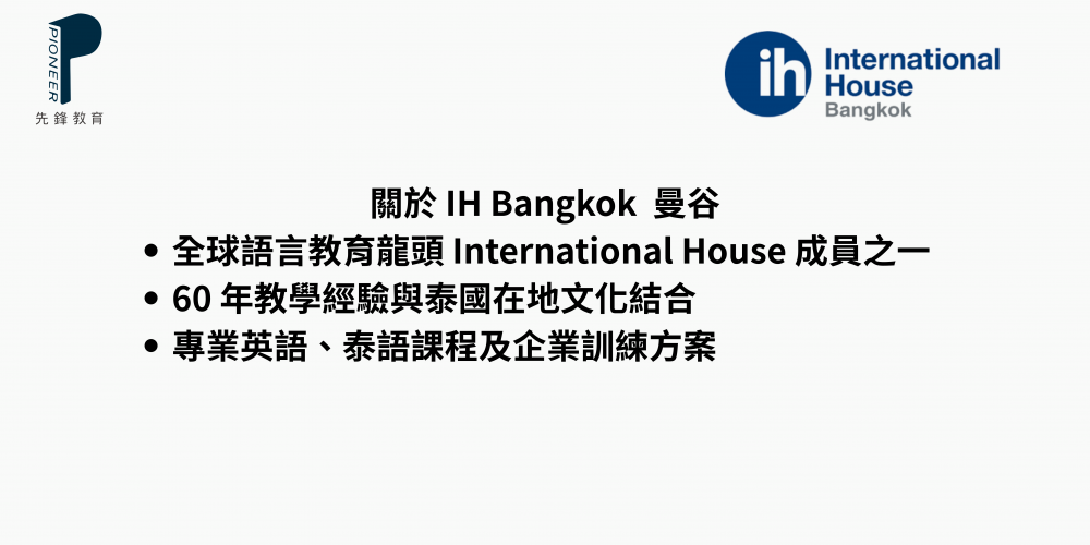 IH Bangkok 位於泰國曼谷,為全球語言教育龍頭 International House 成員,結合 60 年教學傳承與在地文化,提供專業 英語學校 與 泰語課程。採用 CLIL 雙向文化教學法,將課堂理論與現場實踐無縫銜接;小班制+母語師資,保證口說練習超過 80 % 時間,迅速提升 英語會話 與 商務英語 能力。課程類型多元,包括青少/成人一般英語、職場商務英語、IELTS/TOEFL 考試衝刺、CELTA/DELTA 師資培訓,以及地道泰語體驗班。靈活開課模式支援假日班與平日密集班,無論您想強化跨國溝通,或沉浸泰國文化,IH Bangkok 都能為您量身規劃最適合的 國際語言學習