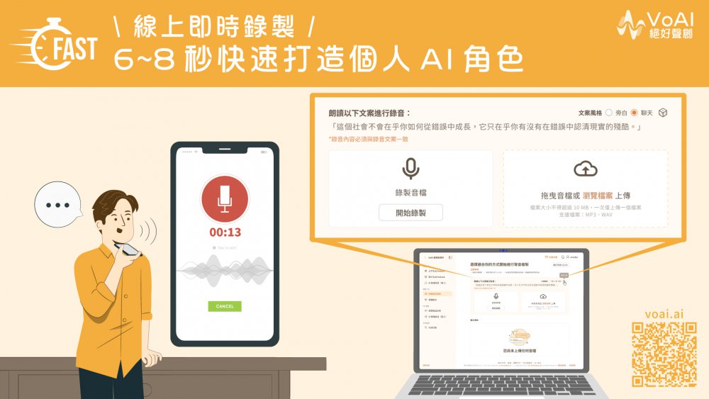 線上 6~8 秒快速複製教師個人聲音,打造獨一無二的特色教學。