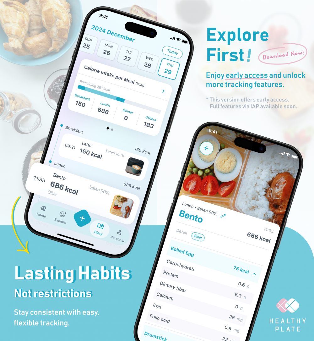 Healthy Plate首創AI影像×AR份量量測的一站式飲食分析平台,10秒內完成熱量與營養計算,從飲食分析出發提供個人化建議,協助用戶建立可持續的健康飲食習慣。