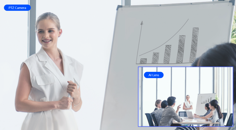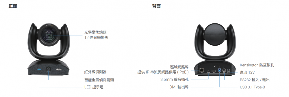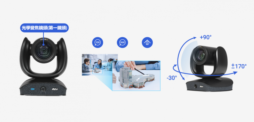 4K 雙鏡頭視訊攝影機 CAM570,搭載 36 倍總變焦鏡頭與 95 度廣角定焦鏡頭,攝影機內建聲音感測器,可偵測並追蹤十公尺內的人聲、智慧畫廊及手勢辨識等 AI 技術,捕捉與會者的一舉一動,超高清畫質忠實呈現細節。