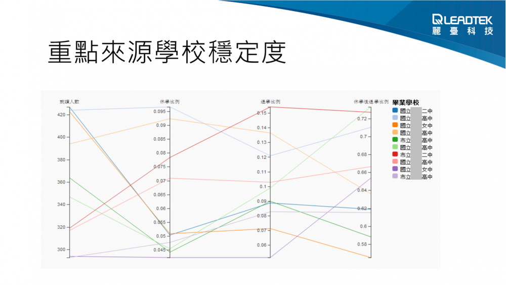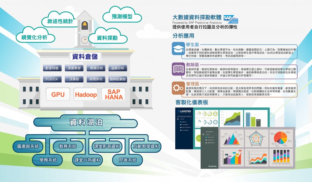 麗臺科技教育大數據解決方案可有系統地整合校內或校外的各式系統,即使是不同檔案格式的資料,皆可匯整成高擴充性的資料倉儲,供分析人員撈取即時且乾淨之資料進行交叉分析,並以即時統計圖表呈現,有效協助使用者挖掘亮點,規劃對策,使決策科學化。