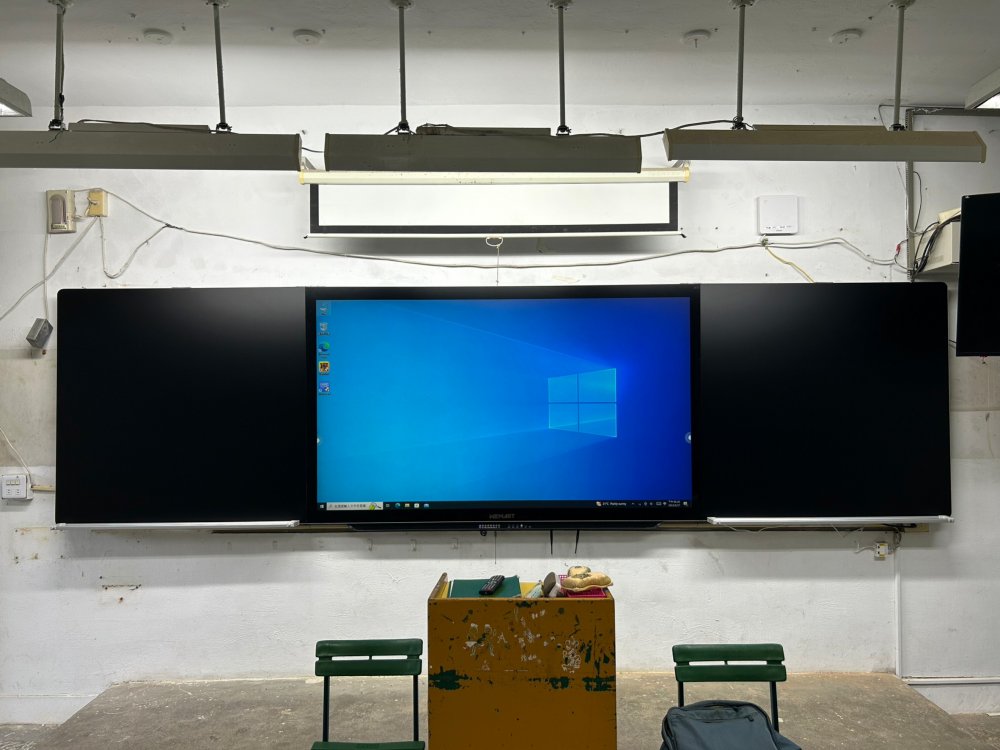 WEMART無塵智慧互動式黑板由三片純平面黑板拼接而成,全平面均可支援水筆、普通粉筆、無塵粉筆正常書寫。中間部分具備大尺寸液晶顯示功能,開啟電源後能夠提供大尺寸高清顯示及高精準度反應速度快的電容式觸控互動教學面板的功能。
