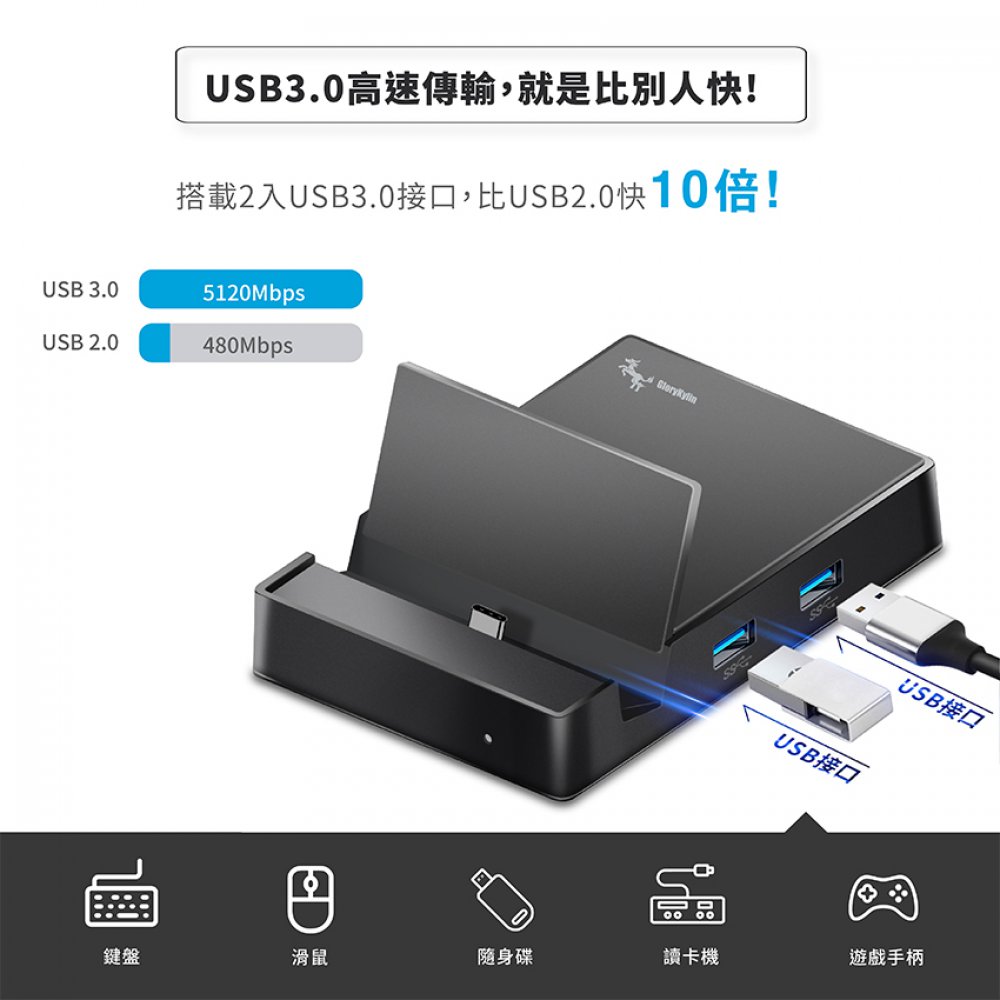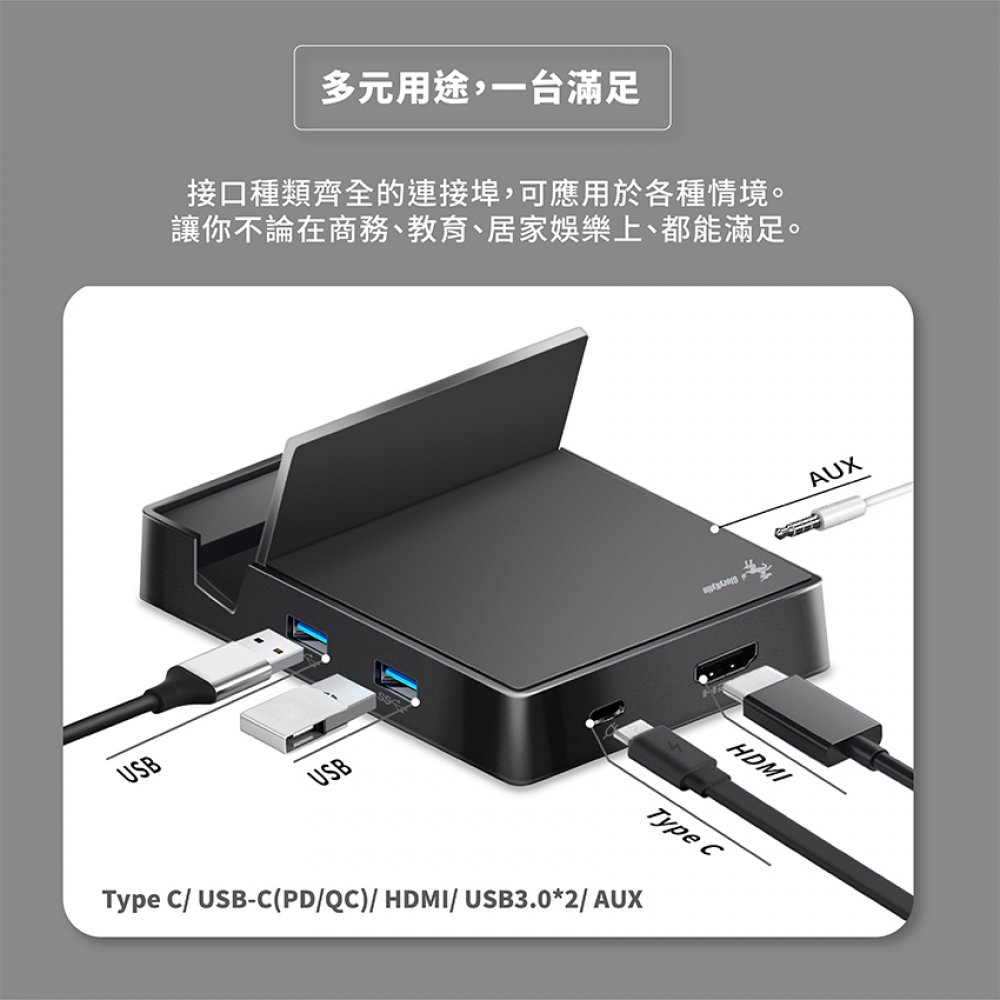 Type C/ USB-C(PD/QC)/ HDMI/ USB3.0*2/ AUX接口種類齊全的連接埠,可應用於各種情境。讓你不論在商務、教育、居家娛樂上、都能滿足。