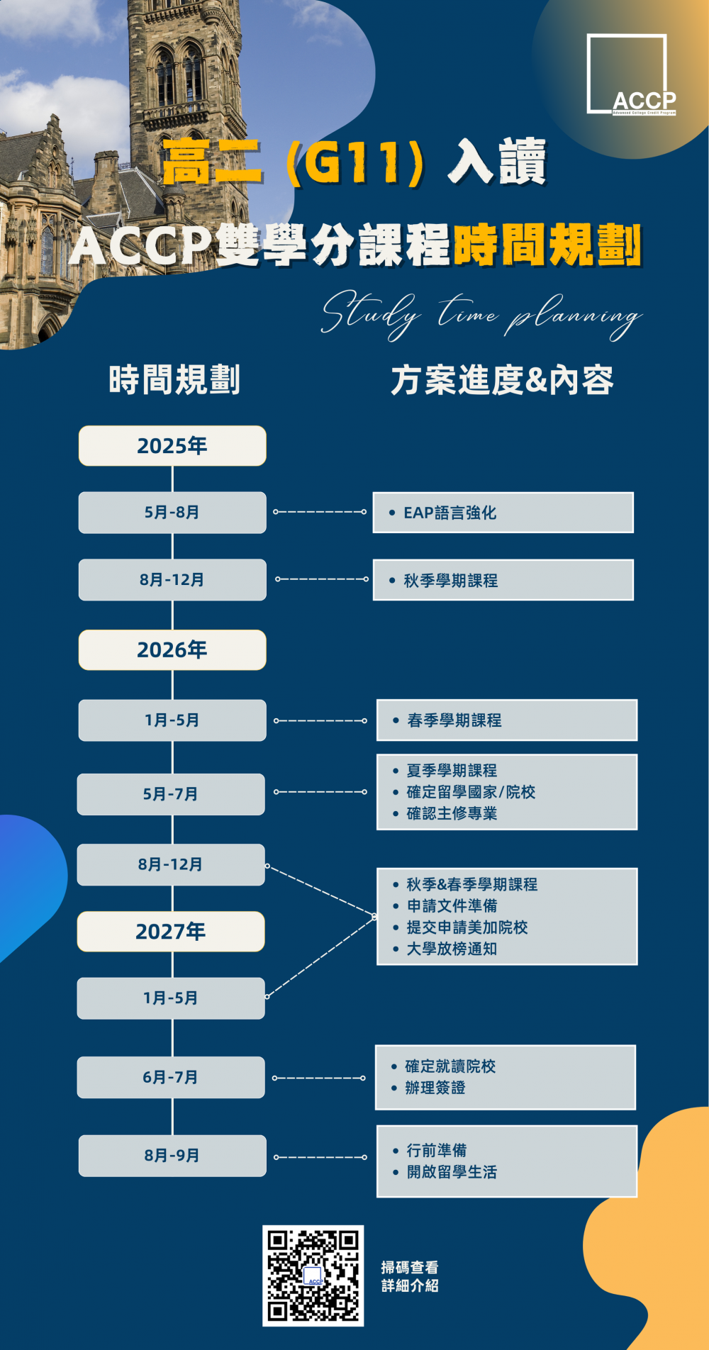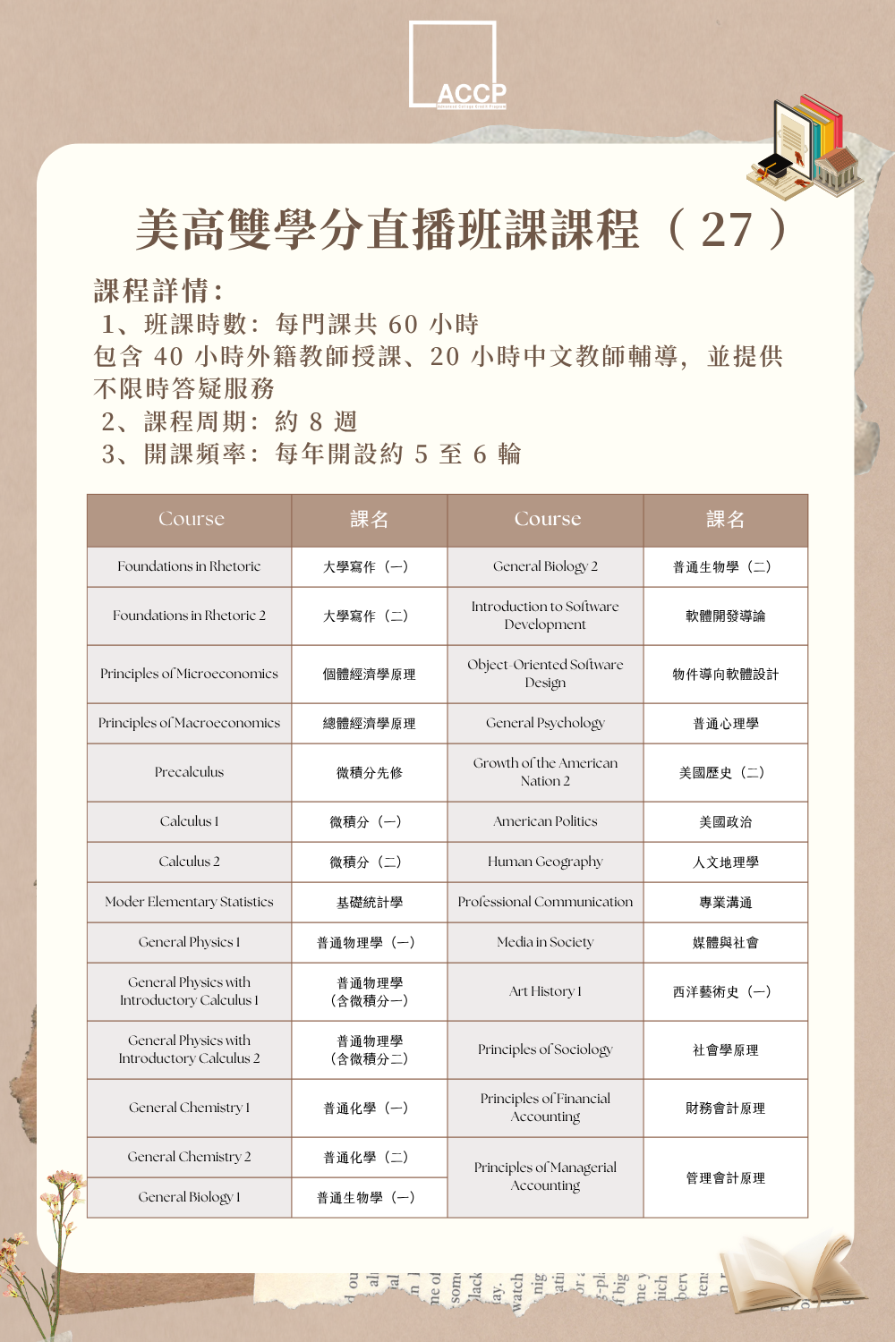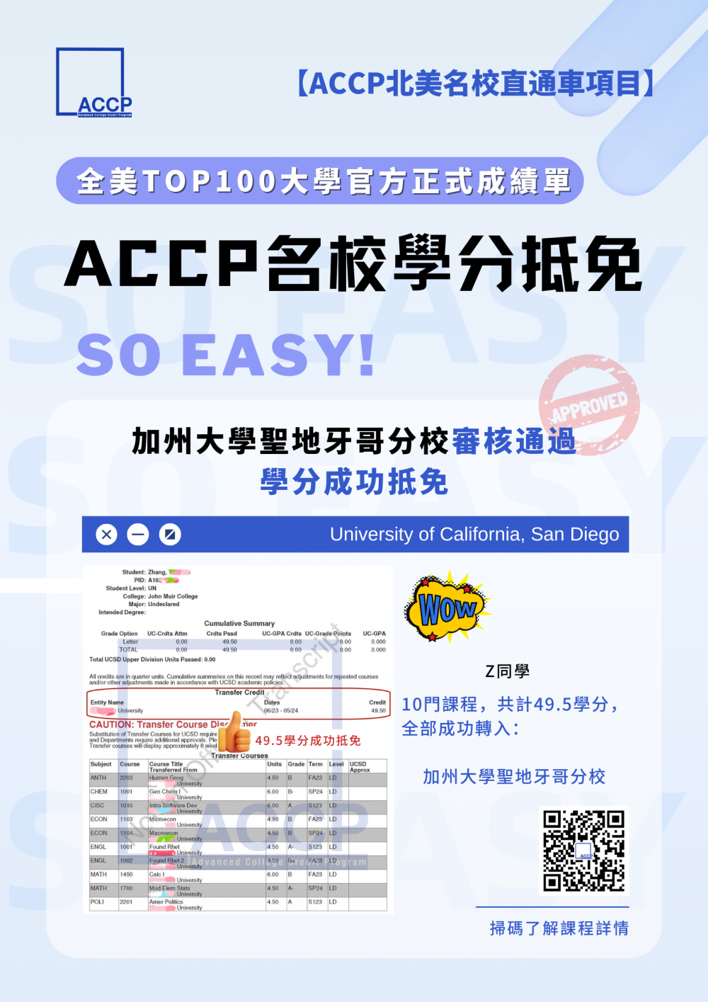 參與此課程的學生將同時獲得美國ACCP大學成績單和美國高中的成績單及畢業證書。學生在學習語言的同時,完成10門ACCP雙學分課程後,可免除標準化考試成績,並攜帶ACCP大學學分進入美國,加拿大,英國,紐西蘭,澳洲等地名校就讀。此課程亦可以幫助以設計藝術類科系升學的同學完成入學前指定的大學學分。