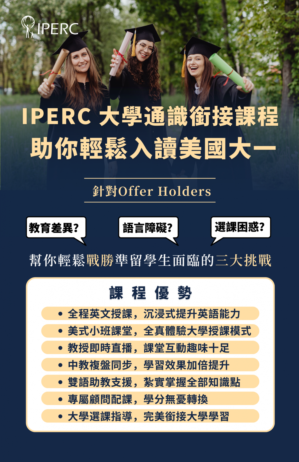 創立於2009年,是註冊在美國俄亥俄州的非盈利國際教育組織,致力於促進全球環境下有效的教育研究、創新和交流。IPERC所提供的服務及課程項目(包含留學、線上課程、競賽項目、短期遊學、STEAM課程等)已經服務超過10,000名學生; 與主要英語留學國家,如美國、英國、加拿大等,穩定合作中學、大學超過150所。其中中學獨家代理20多所,與13所大學成立了ACCP聯盟,打造獨特升學路徑。