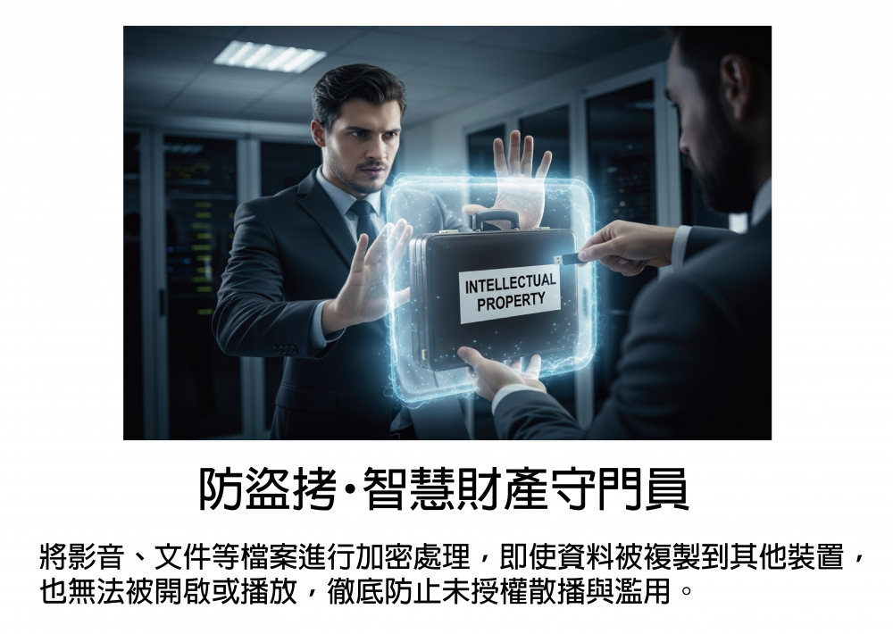 ‧六大技術:防盜拷、防側錄、時限管理、權限管理、浮水印、防刪防毒USB