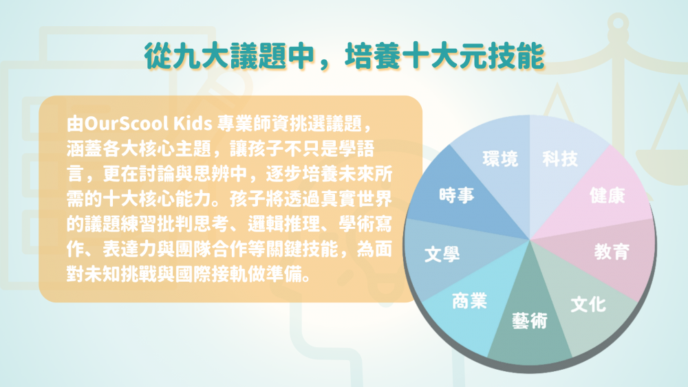 從各大議題的探討與思考碰撞中,孩子能逐步地建構出具有邏輯性的思維模式,並能夠清晰且有說服力地表達自己的觀點。