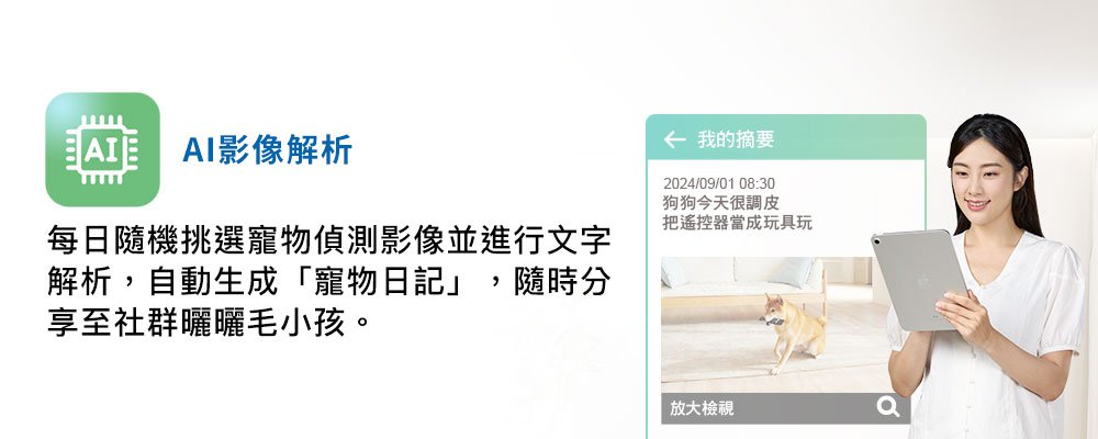 全新推出的Hami Cam AI智慧攝影機,內建台灣製造晶片並提供高規格加密傳輸,保障客戶影像隱密性,除包括2K全時錄影、雙向對話和影像雲端保存7天功能,支援寵物、陌生人、聲音和人形等AI偵測模式,當偵測異常,即會自動觸發APP推播告警通知;此外還可透過AI影像解析,每日隨機挑選寵物影像並進行文字解析,自動生成「寵物日記」,隨時分享毛小孩的可愛調皮時刻至社群給親朋好友。