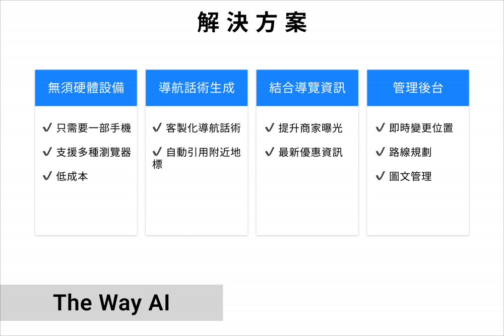 我 們 聚 焦 於 校 園 、 醫 院 、 展 覽 館 、 百 貨 商 場 等 複 雜 建 築 空 間 , 提 供 使 用 者 直 覺 、 即 時 且 不 依 賴 額 外 硬 體 設 備 的 導 航 解 決 方 案 ,我 們 的 導 引 技 術 完 全 不 依 賴 藍 牙 或 Wi-Fi 定 位 , 改 以 視 覺 定 位 或 模 擬 動 線 演 算 法 進 行 路 徑 計 算 。