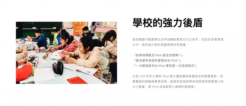 已為 150 所中小學的 iPad 做大量部署與裝置設定的極電資訊,有著豐富的經驗與專業技術,能夠有效協助學校消除使用與管理上的大小疑慮,使 iPad 成為教育上最棒的推進器。