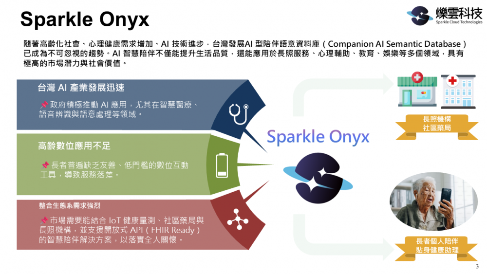 在高齡社會中,我們觀察到許多長者雖然擁有豐富的人生閱歷,卻因缺乏直覺友善的數位介面而難以享受數位生活。Sparkle Onyx 以語音為核心,結合多模態感知與 AI Agent 技術,打造 低學習門檻、主動互動 的 AI 陪伴體驗。透過情境記憶與情感理解,建立「會記得你、懂你情緒」的虛擬夥伴,讓科技成為日常生活中溫暖可靠的陪伴者。