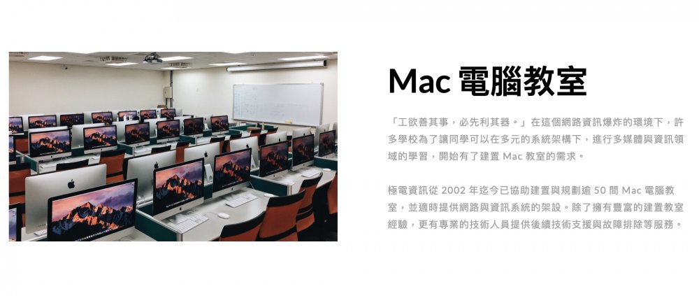 極電資訊從 2002 年迄今已協助建置與規劃逾 50 間 Mac 電腦教室,並適時提供網路與資訊系統的架設。除了擁有豐富的建置教室經驗,更有專業的技術人員提供後續技術支援與故障排除等服務。