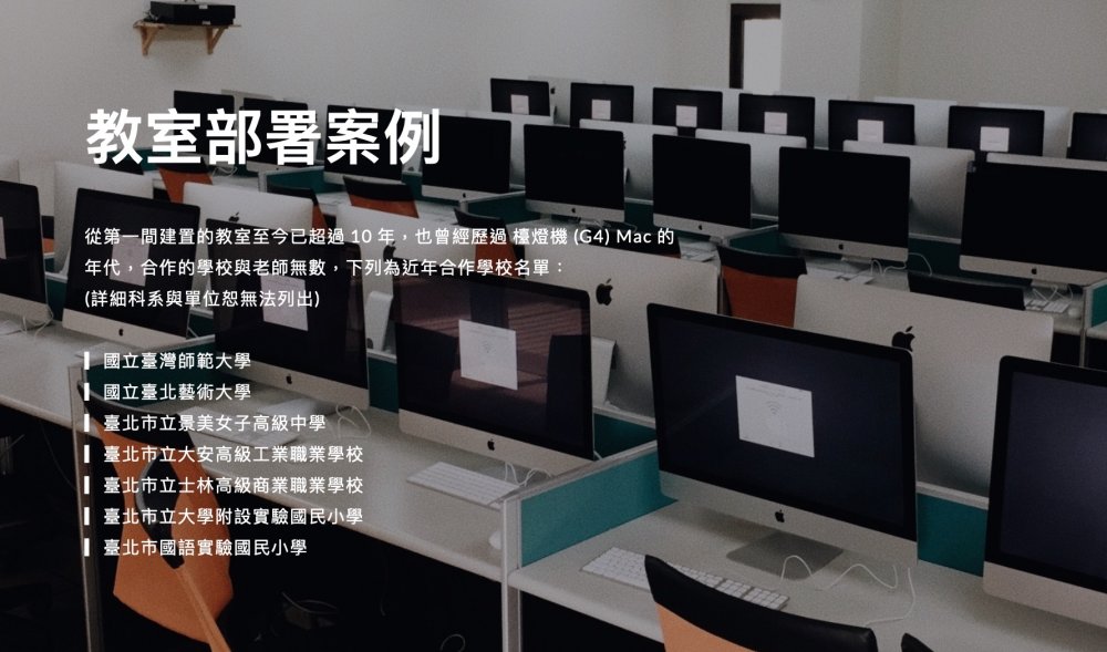 從第一間建置的教室至今已超過 10 年,也曾經歷過 檯燈機 (G4) Mac 的年代,合作的學校與老師無數,下列為近年合作學校名單: