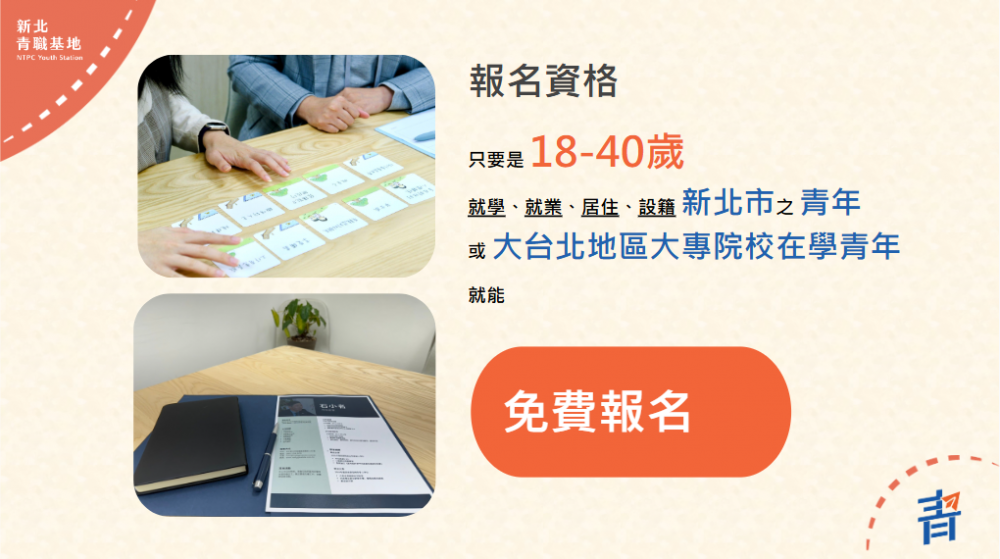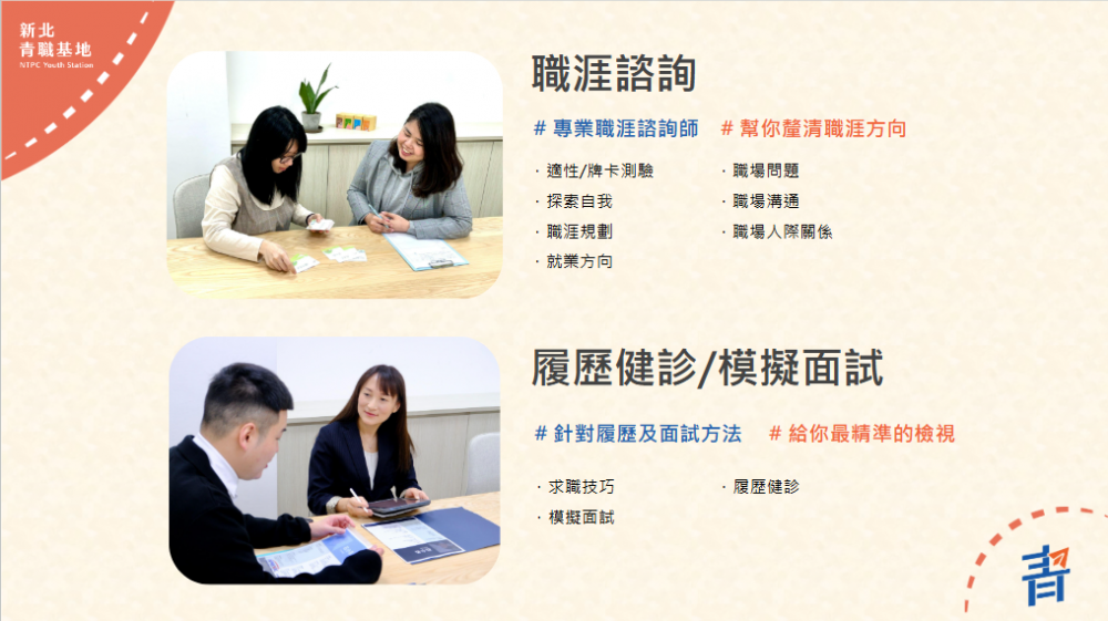 青年職涯服務:針對青年初次尋職、轉職、斜槓工作面臨的職涯問題,舉辦培力課程、職涯諮詢、企業參訪與實習等。
