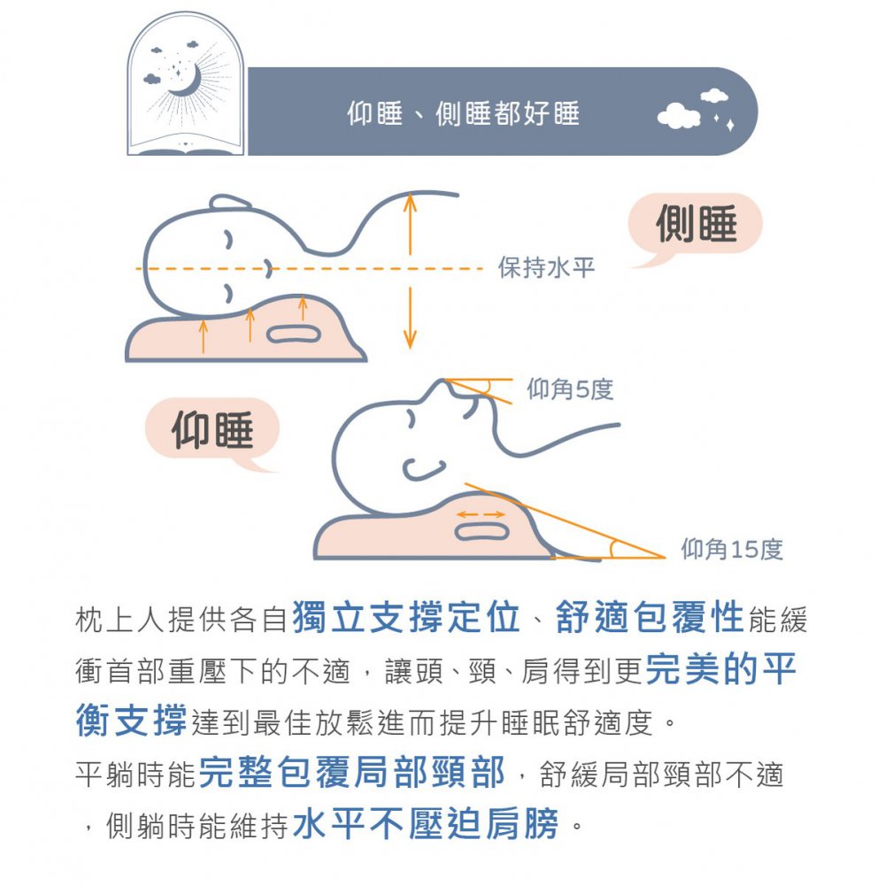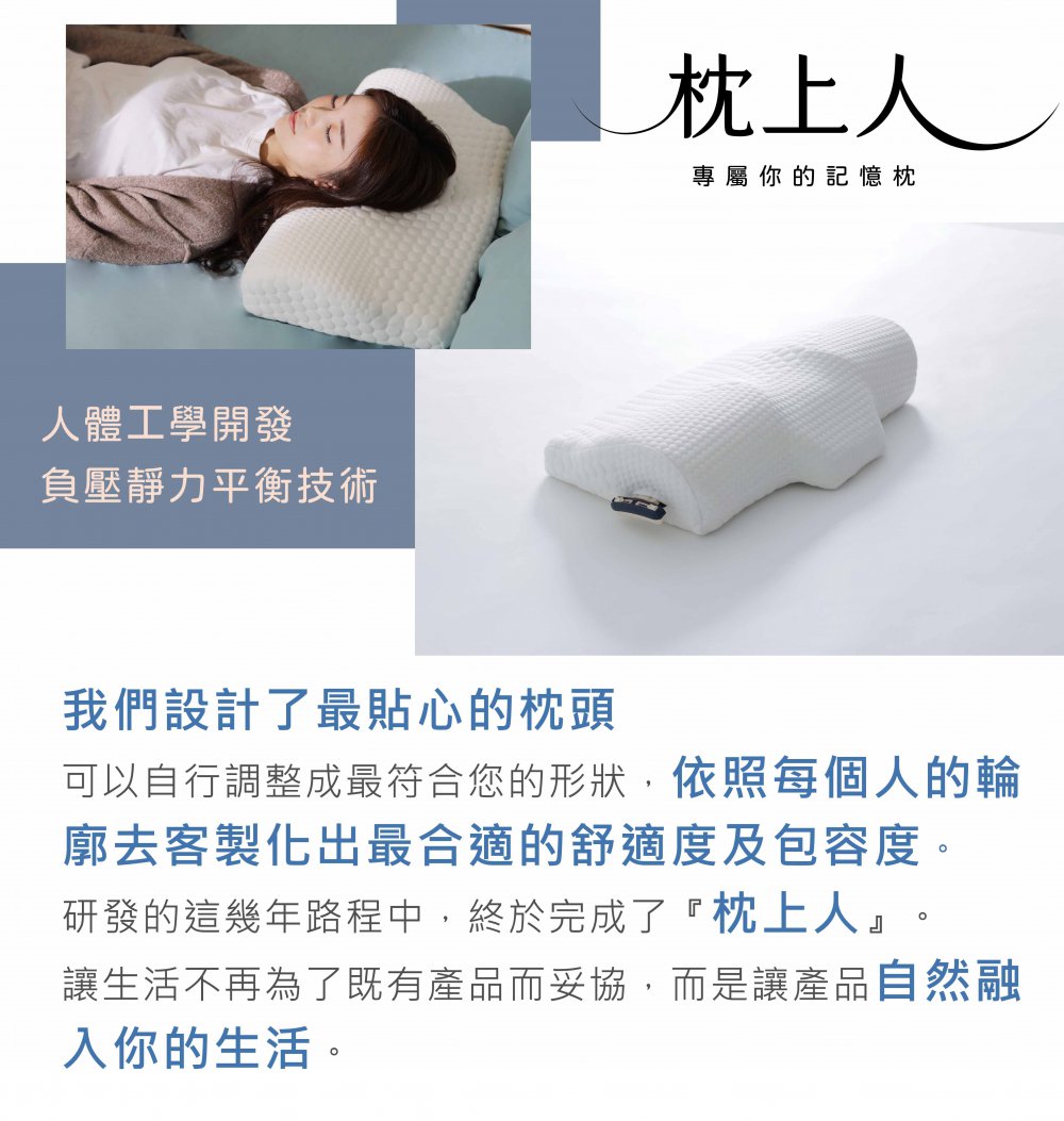 從超越人體工學開發核心搭配獨家負壓靜力平衡技術,研發多年的路程中,我們終於設計完成了最貼心的枕頭【枕上人】可以自行調整成最符合您的形狀,依照每個人的輪廓去客製化 找出最舒適的高度及包容度,生活不再了既有產品而要妥協,而是讓產品自然融入你的生活。