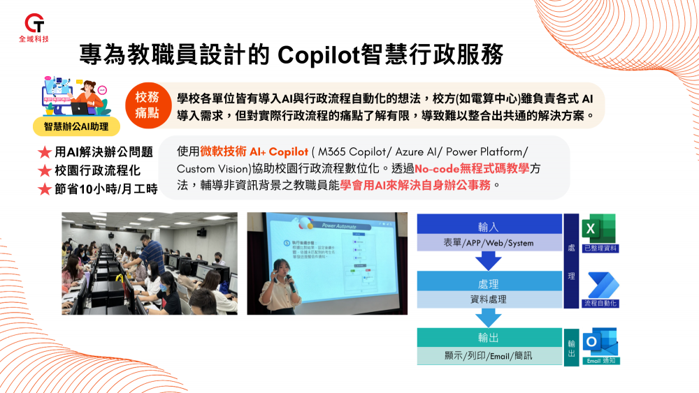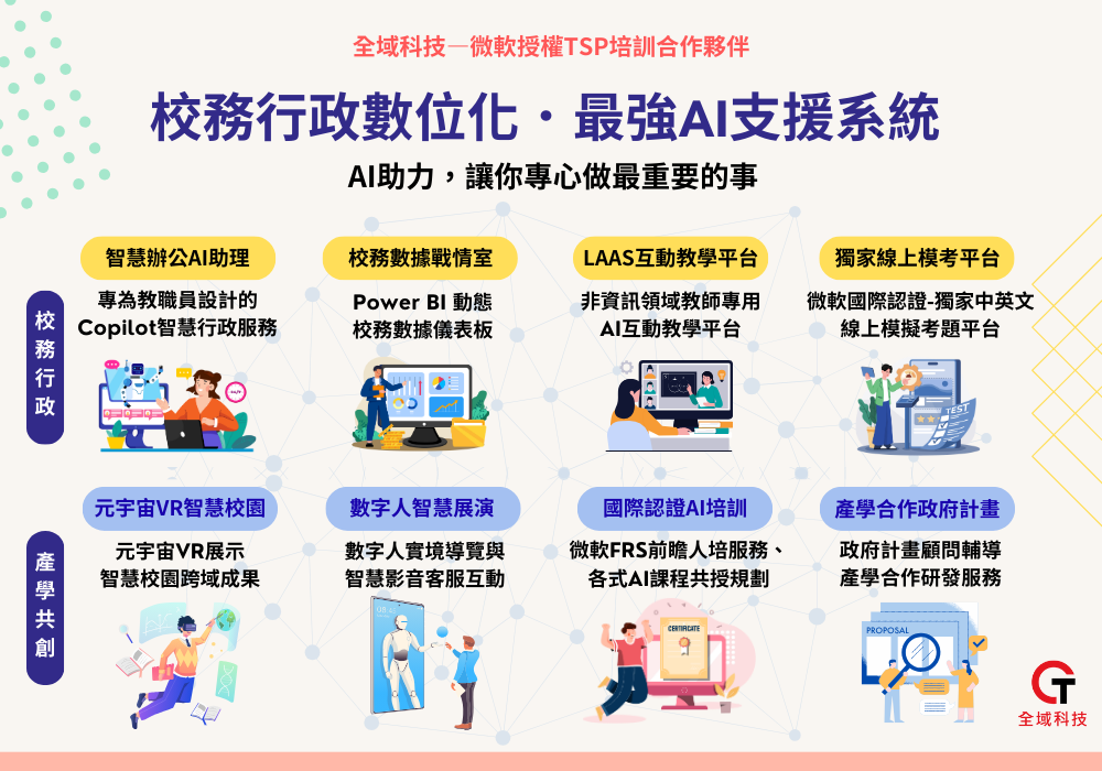 針對校園行政與教職員教學各式不同需求,提供校園多種一站式服務:包括協助優化日常行政工作的「智慧辦公 AI 助理」、提升決策效率的「校務數據戰情室」、促進AI互動學習的「LAAS 教學平台」、打造沉浸式場域體驗的「元宇宙 VR 智慧校園與數字人展演」,以及強化AI專業力的「AI 國際認證與模考平台」。可依照學校需求彈性選用,協助各級學校全面邁向智慧教育新階段。