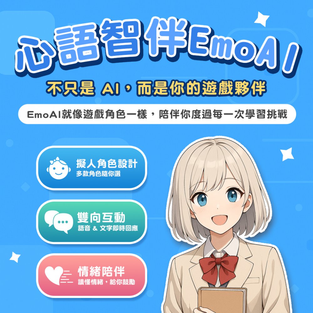 EmoAI 心語智伴是款創新的智慧學習夥伴,將人工智慧技術轉化為能陪伴學生、激發學習潛能的應用,讓學習旅程不再孤獨,而充滿冒險的樂趣。