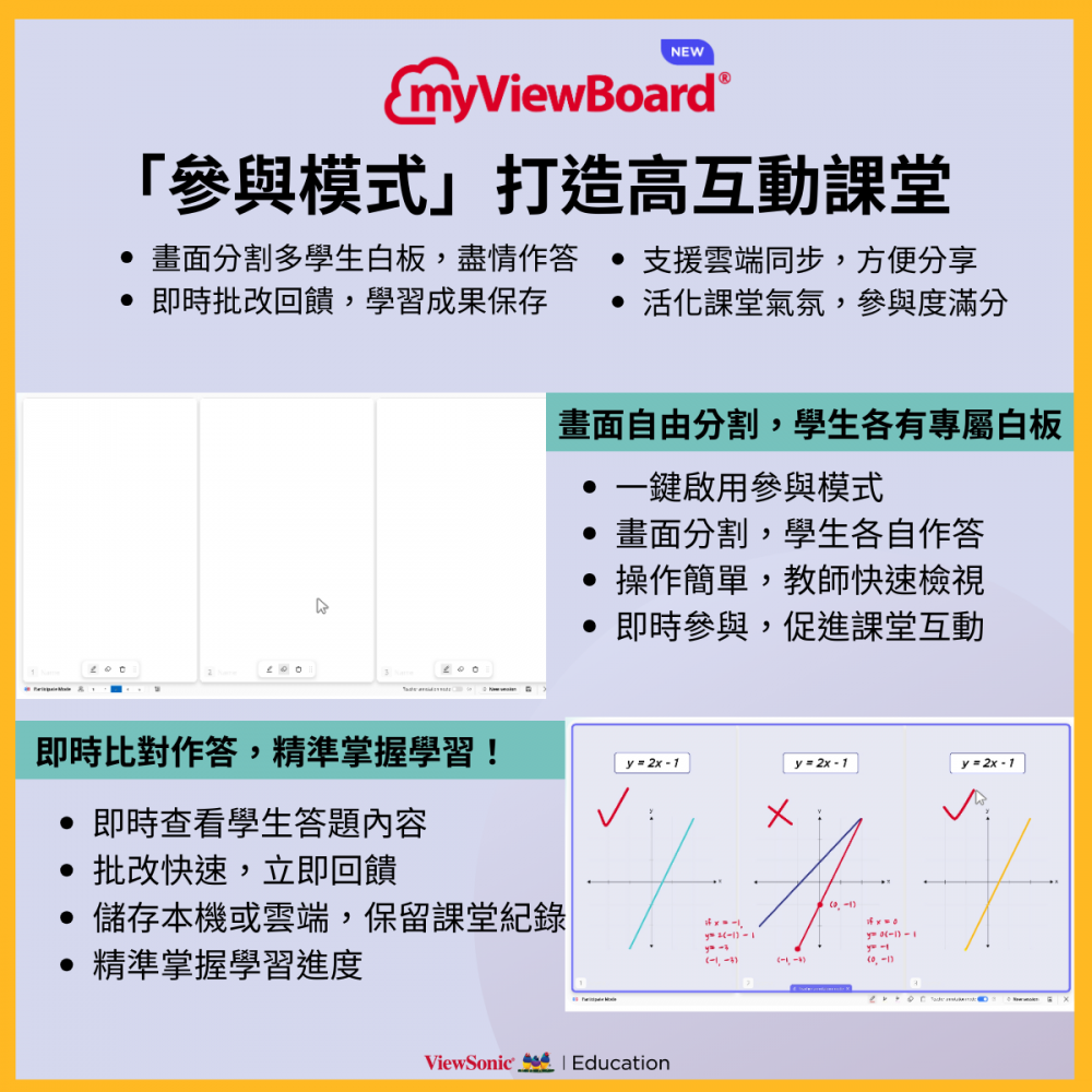 有效的學習不該只是單向傳授!教師可以運用 myViewBoard 輕鬆建立一個雙向互動的學習環境,讓學生可以透過個人裝置積極參與學習,實現生生有平板,課堂高互動!
