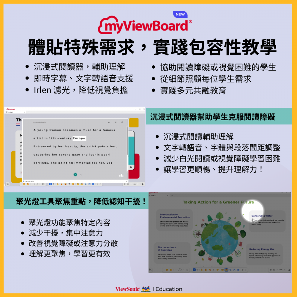 因應全球數位轉型趨勢,教育數位化近幾年快速發展,能夠提升教育者與學習者之間溝通模式的互動電子白板將變得至關重要。ViewSonic率先推廣整合環境建置、師資培訓、課程設計的全方位EdTech理念,將科技真正落實教學現場,讓科技真正為教育轉型服務。搭配ViewBoard的myViewBoard軟體解決方案,透過軟體、硬體整合及完整的生態圈,提供最佳使用者體驗,並能支援如Amazon Web Services、Microsoft Azure、Google for Education、Intel Unite的解決方案。ViewSonic董事長暨執行長朱家良期許:「孩子是台灣未來的希望,投資教育就是投資台灣的未來。讓科技成為教育的支點,只要孩子想學、老師想教,我們會和教育界一起努力,讓孩子與世界站在同一個起跑點上。」