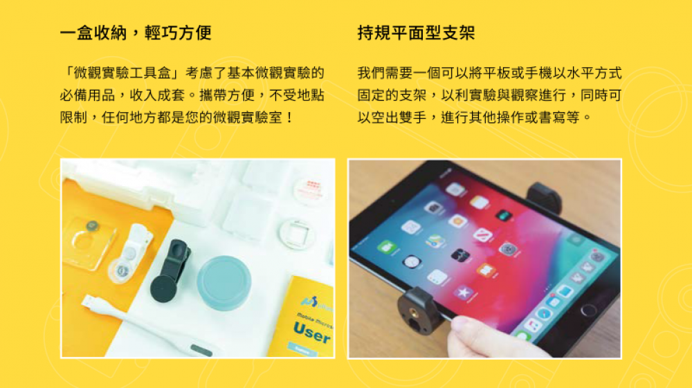 一組體積超小、攜帶輕便的手機顯微鏡,利用貼紙採樣,就像擁有超能力,瞬間走入全新的世界!STEAM 教育、親子共學或是藝術創作靈感,uHandy 不是你尋常可見的科普玩具,而是發掘隱藏驚喜的強大工具。