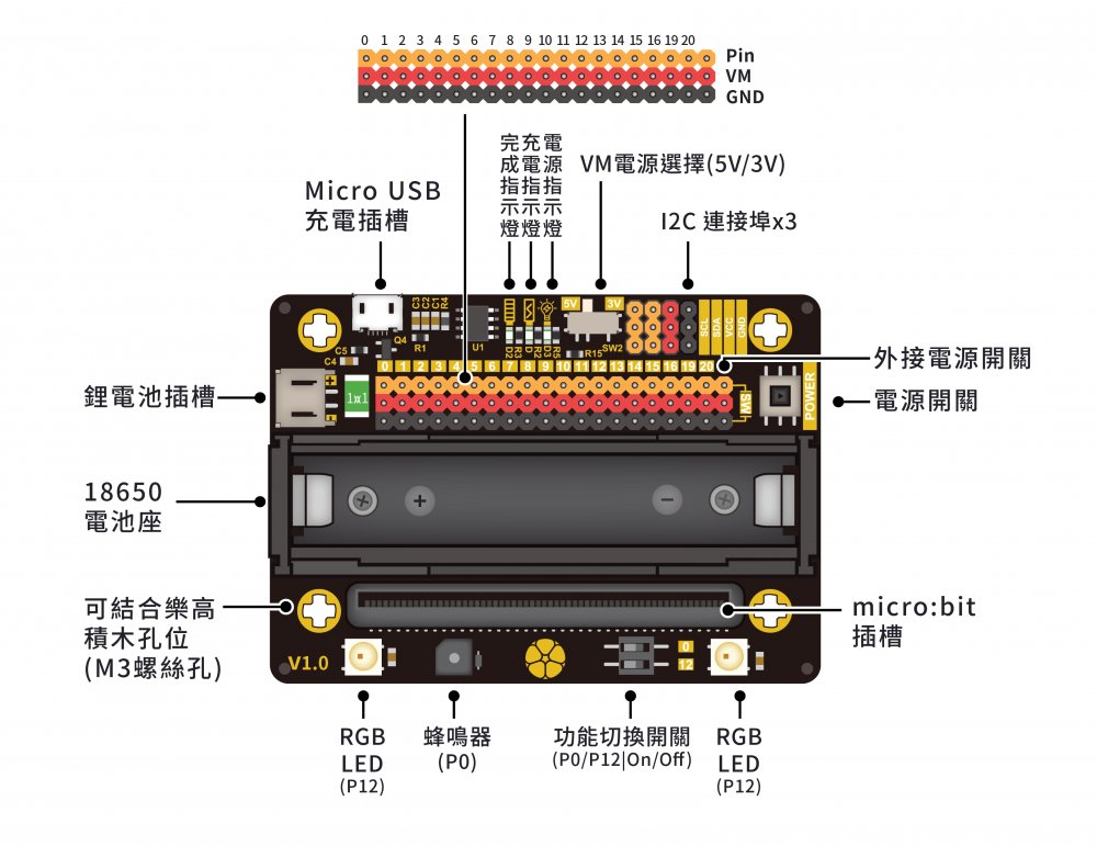 三組 I2C 連接埠、micro:bit接腳、外接電源開關