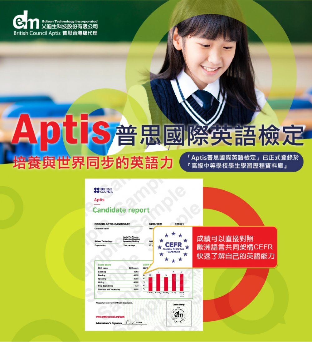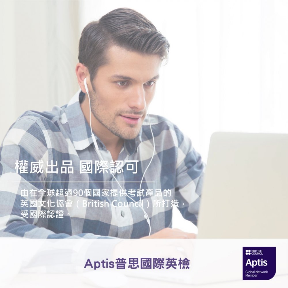 「Aptis普思國際英語檢定」是由全球舉辦英語檢測考試將近80年的英國文化協會(British Counsil)所研發的一種創新型英語能力測評系統,經由國際頂尖測評專家根據最新研究理論,因應個人、教育及企業機構不同需求設計而成,得到廣泛的研究和技術分析,能夠精確評估應試者的英語能力水平。