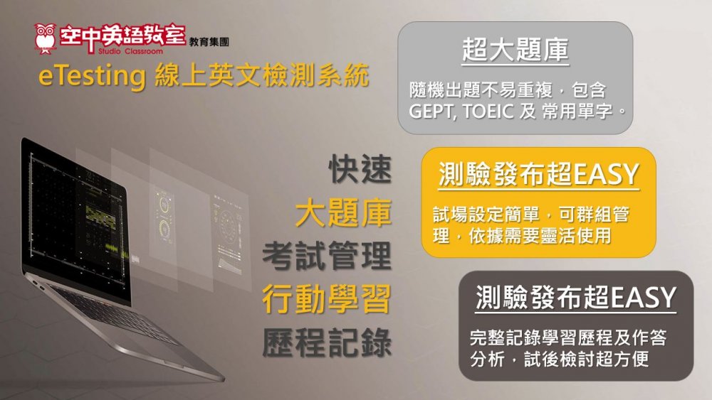 E-Testing線上英文檢測系統,內建空中英語教室專業的GEPT模擬試題,能針對GEPT聽力及閱讀題型有效練習。系統設計前測可了解學生程度。學生端可利用系統進行模擬測驗熟悉題型、可針對單項題型弱點強化。試題提供詳解,可作為自習使用。內建晉級功能幫助學生逐步打底。