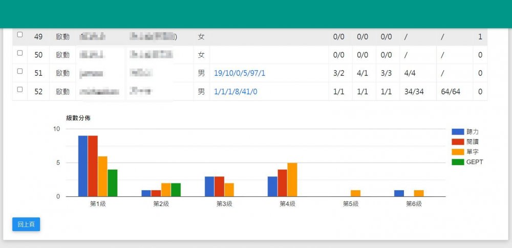 ,鼓勵學生使用英檢系統練習提升英語實力,透過系統的學習紀錄可以了解學生練習次數、能力分布,加上出題的便利性大大降低老師的負擔,精準掌握學生學習狀況。