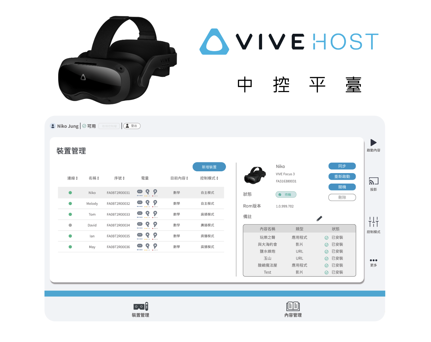 在操作者的裝置(如:智慧教室中的智螢幕/ 手機/ 平板) VIVE頭戴式顯示器上安裝中控平台應用軟體,操作者可以在簡單明瞭的介面上,檢視所有裝備的連線狀況、電力及管理裝備上的內容與更新;在課堂或教育訓練時,只需要一鍵按下啟動,就可同步推播相同內容讓現場所有的頭戴式顯示器,可透過手機/ 平板監看各個頭盔內的畫面,與課堂上所有參與者分享與解說課程內容之用。