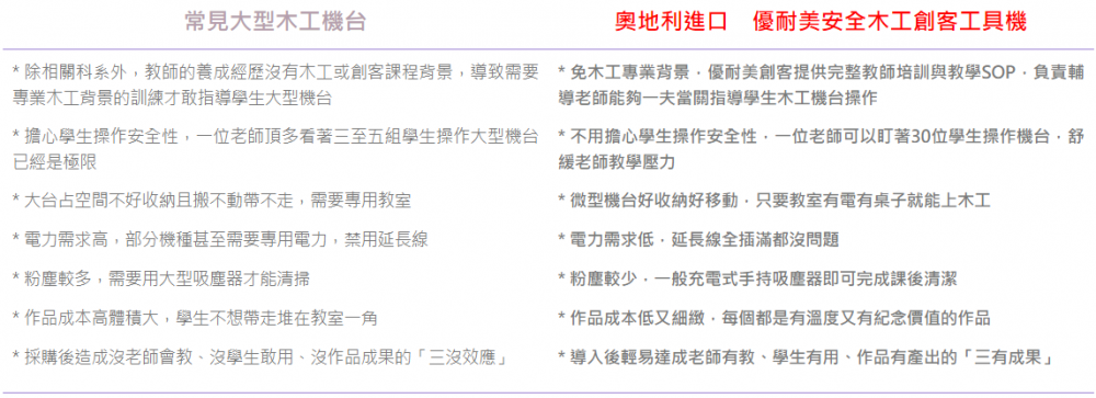 且大力推薦優耐美安全木工創客工具機為創客教室(生活科技教室/木工教室)的必要設備。