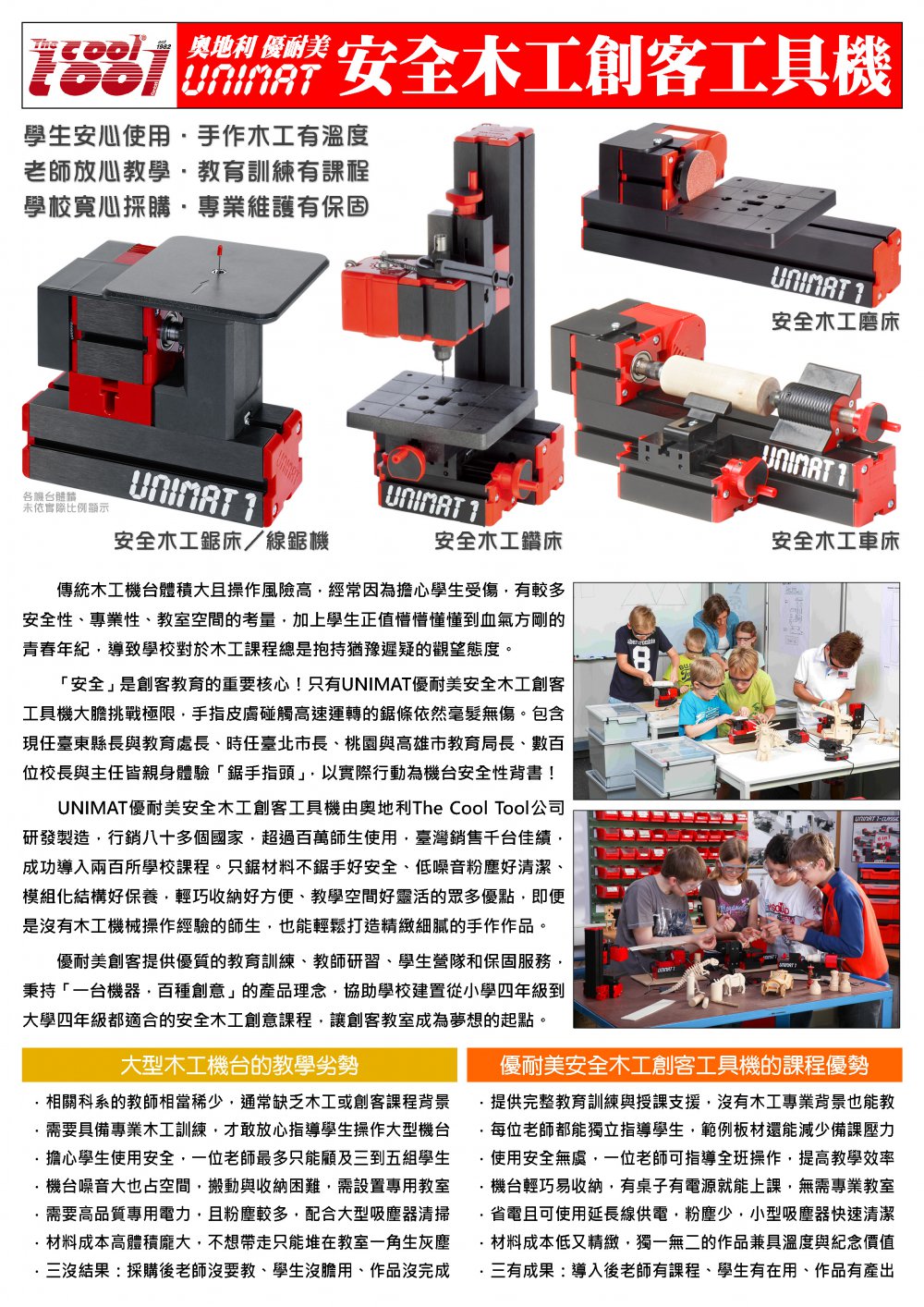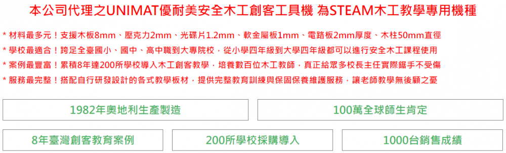 優耐美創客有限公司為「奧地利The Cool Tool公司UNIMAT安全木工創客工具機」與「孫易新心智圖法:中學生/小學生心智圖學習法」臺灣代理商,積極推廣安全木工創客機台與心智圖學習法於各級學校,並且協助學校採購各式教學軟硬體。